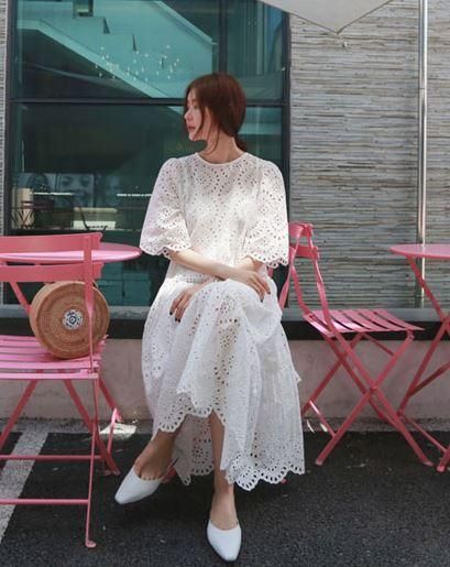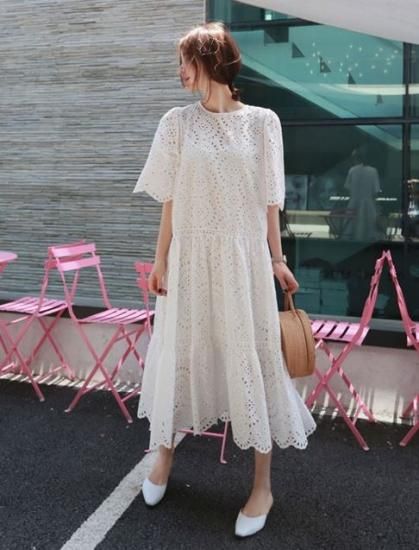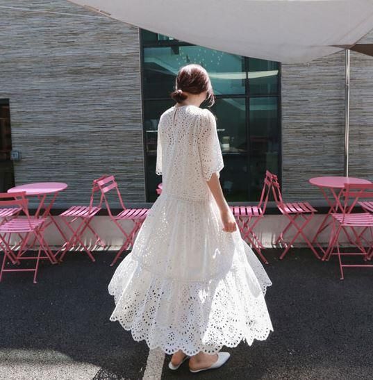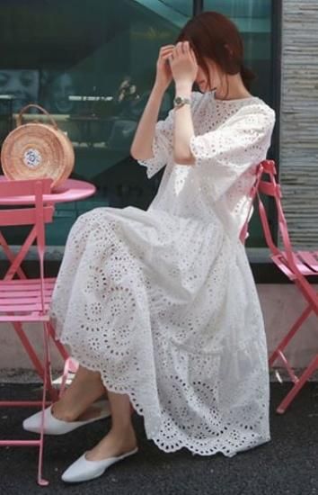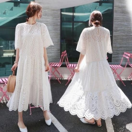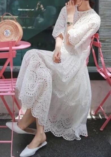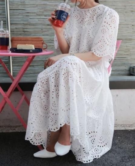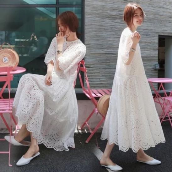 リゾート ロングワンピース レディース ホワイト レース ロング丈 ワンピ 夏 新作 可愛い サマードレス 五分袖 ペプラム ゆったり リゾート ロングワンピース レディース