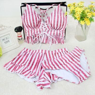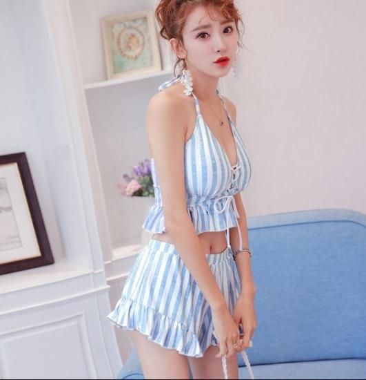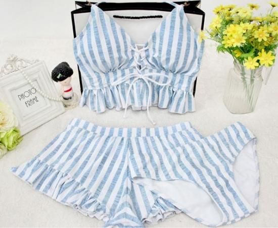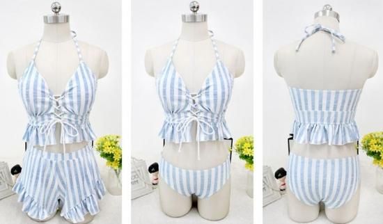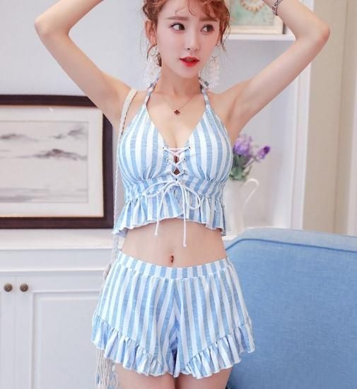 水着 ビキニ レディース 体型カバー ストライプ柄 タンキニ セット水着 夏 新作 リゾート かわいい レースアップ 3点セット ビスチェ ショートパンツ 三角 ビキニ セット 水着 スイムウエア