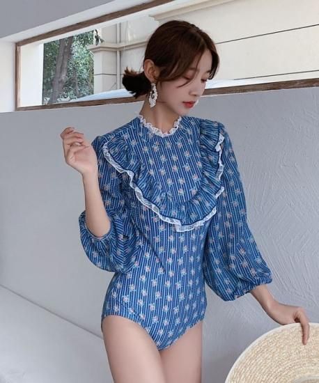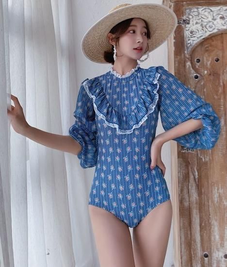 水着 ワンピース 体型カバー ワンピース水着 オールインワン 水着 ワンピース 40代 ママ 大きいサイズ 水着 レディース レトロ 可愛い 夏 新作 花柄 フリル 長袖 ハイネック ワンピース 水着