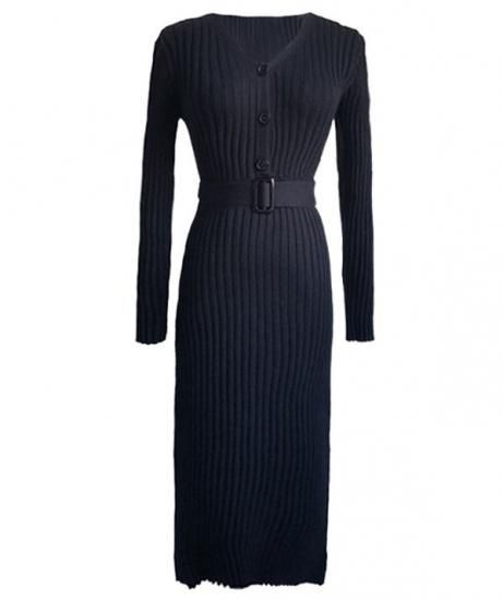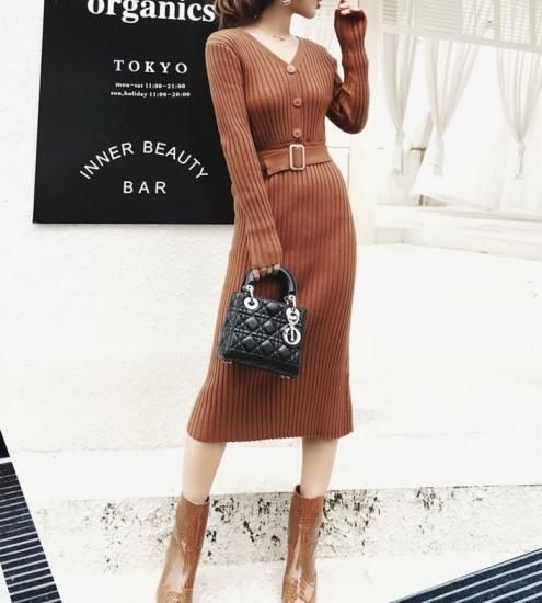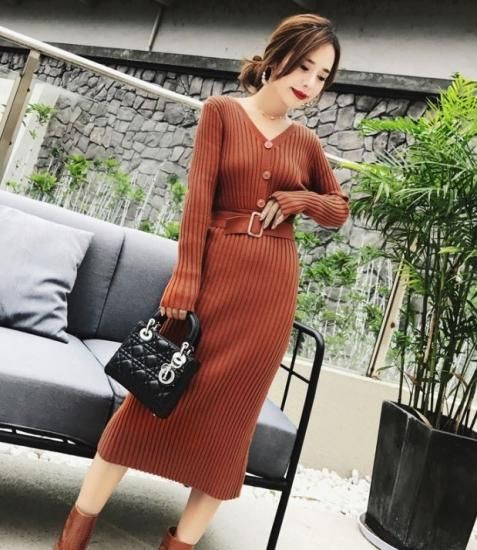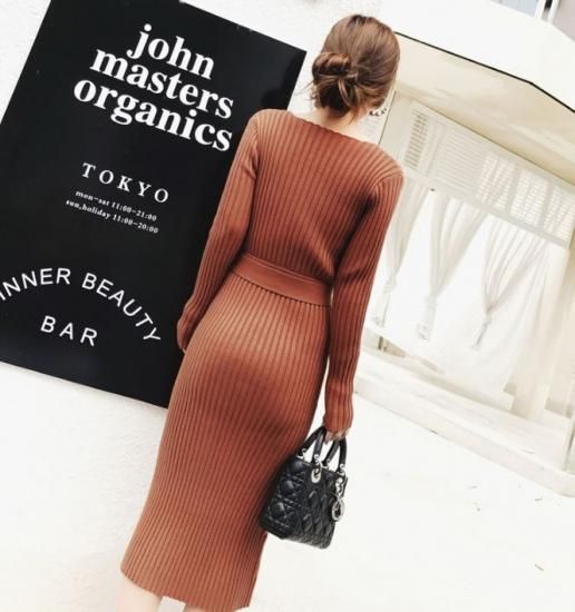 ニットワンピース ニットワンピ レディース ミモレ丈 ひざ丈 Vネック 長袖 スリム Aラインスカート ニット ワンピース ワンピ 秋冬新作 秋 秋色 秋服 秋sale ニットワンピース ニットワンピ