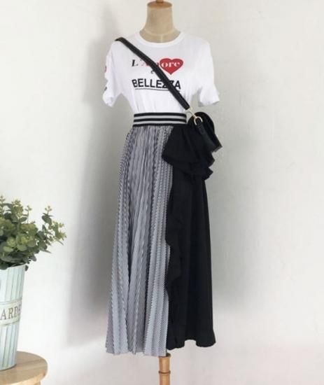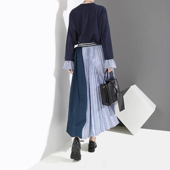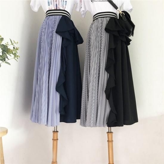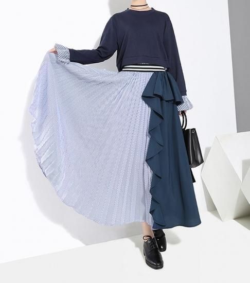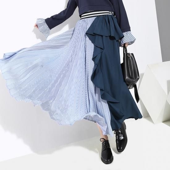 スカート プリーツ レディース ボトムス 大きいサイズ フリル ロング丈 マキシ丈 スカート ストライプ コンビ バイカラー 秋冬新作 秋 秋色 秋服 秋sale ゆったり フレア スカート プリーツ