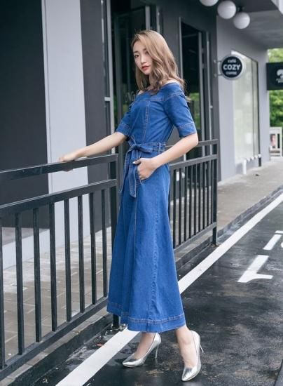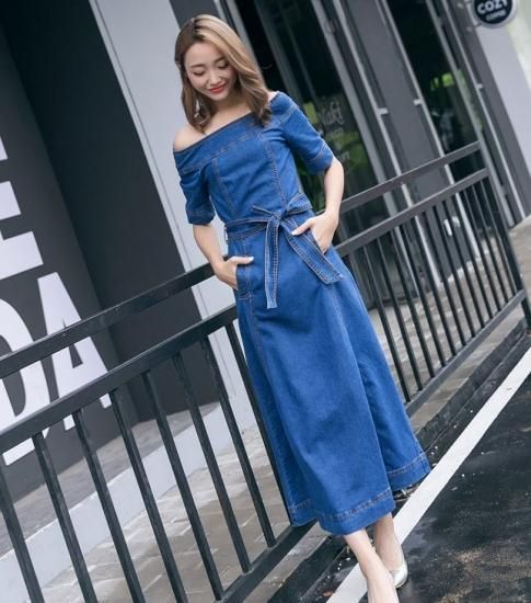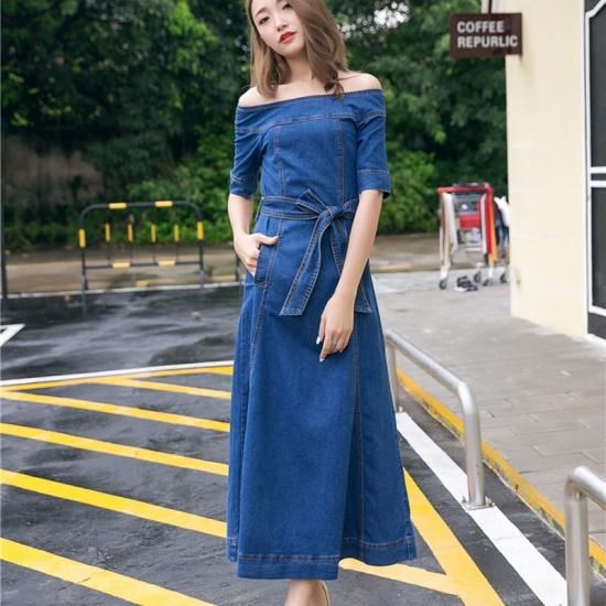 デニムワンピース デニムワンピ レディース 大きいサイズ オフショルダー 5分袖 ロング丈 マキシ丈 デニム ワンピース ワンピ 秋冬新作 秋 秋色 秋服 秋sale デニムワンピース デニムワンピ