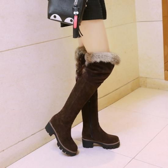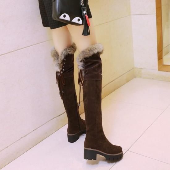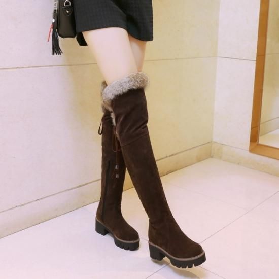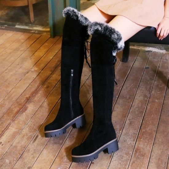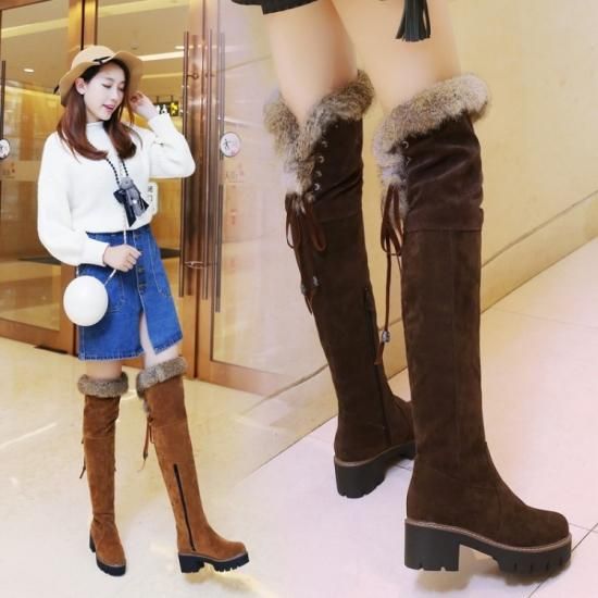 ファー付きニーハイブーツ ロングブーツ ニーハイ ベロア 太ヒール 歩きやすい あったか 新作 秋 冬 ガーリー 女子力 定番 脚長効果 サイドジッパー ゆったり 大きいサイズ かわいい