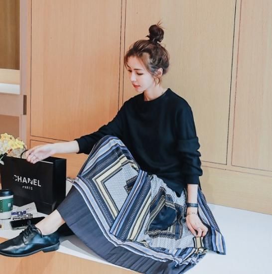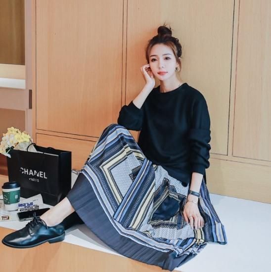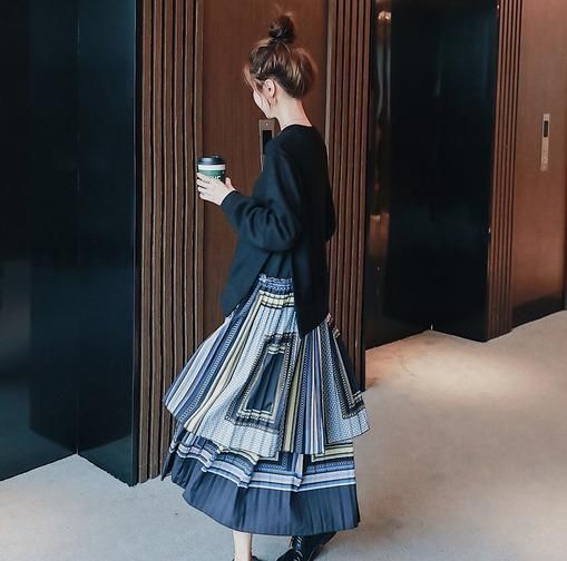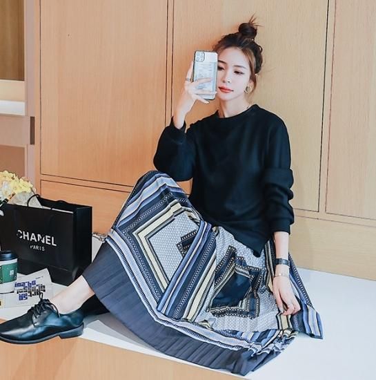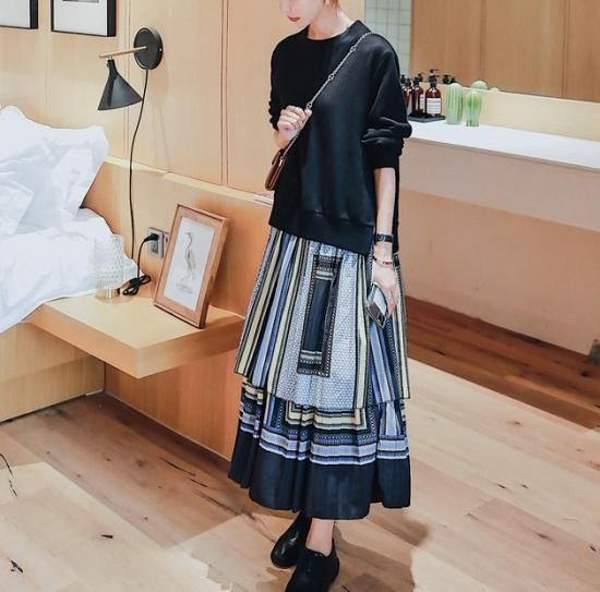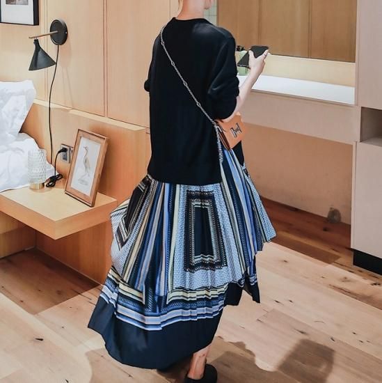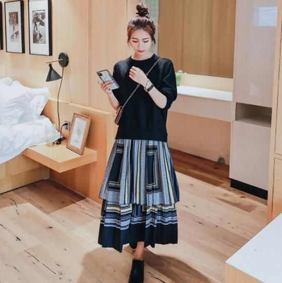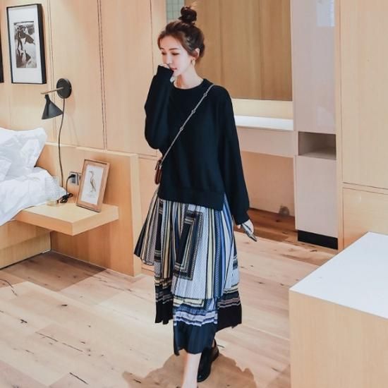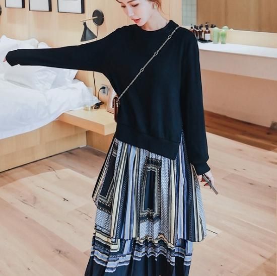 【取寄】ワンピース ロングワンピース 秋冬 長袖 ドッキングワンピース ニット プリーツスカート 幾何学模様 ロングワンピ ワンピース ロングワンピース 秋冬 長袖 ドッキングワンピース ニット