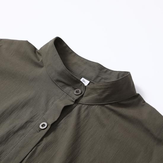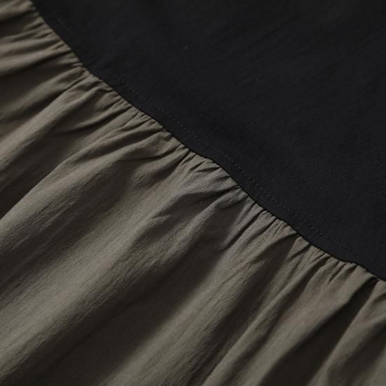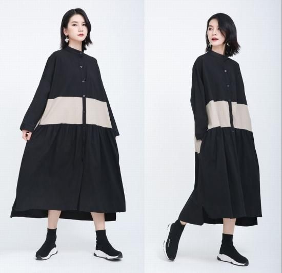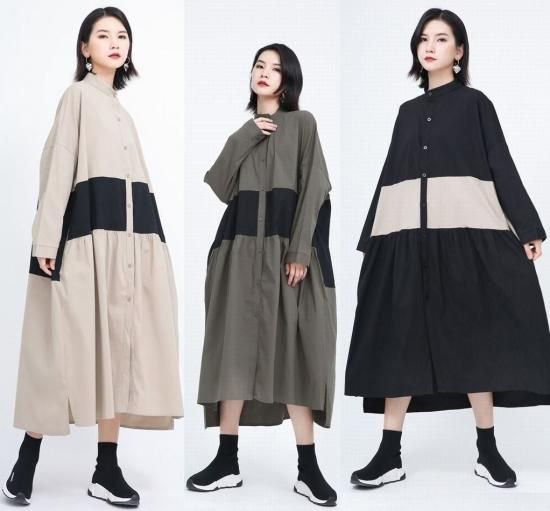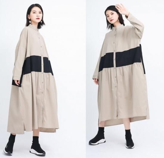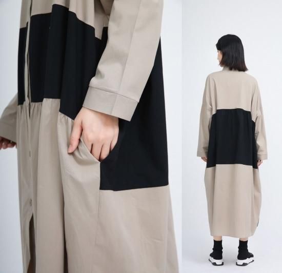 バイカラーワンピース シャツ センターライン 個性的 海外デザイン ハイネック 体型カバー マタニティ 妊婦 ワンサイズ カジュアル 大人気 秋カラー おしゃれ ミモレ丈 ロング