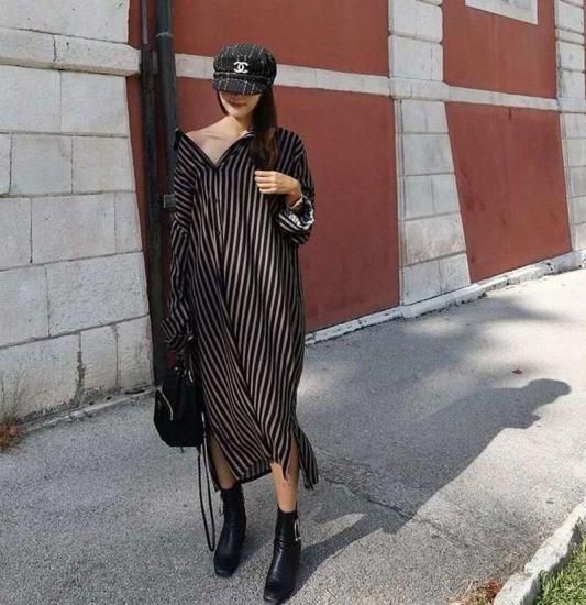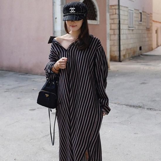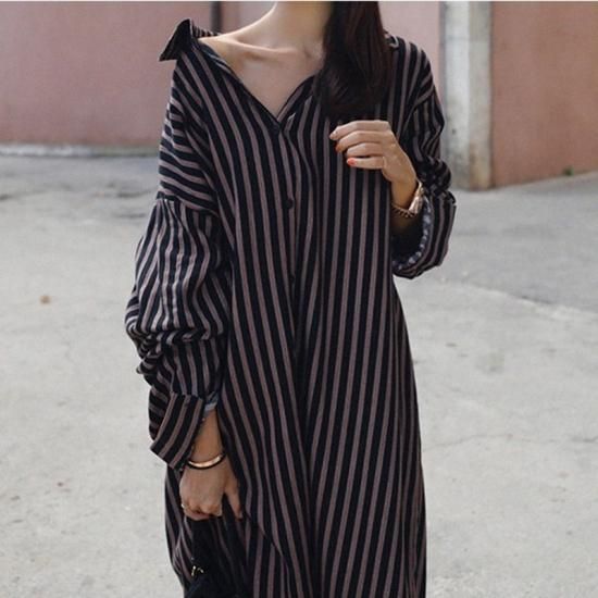 シャツワンピース ストライプ ロングシャツ シック クール 海外ファッション 韓国ファッション 大人気 ブロガー ギャル 体型カバー 重ね着 オフショル風 スリット ロング丈 オーバーサイズ