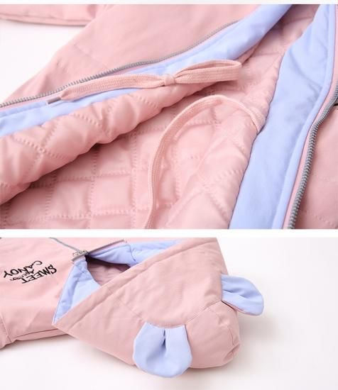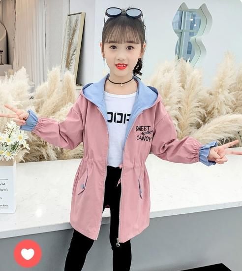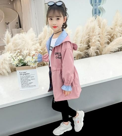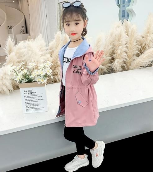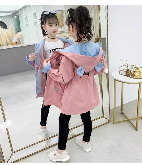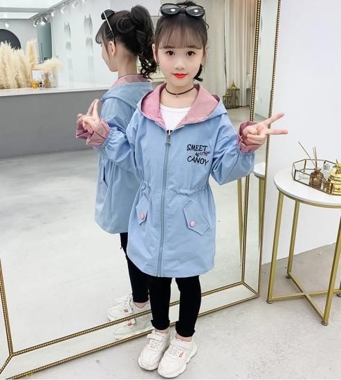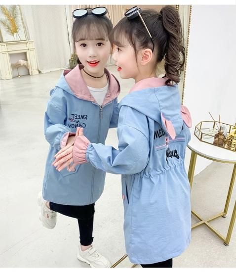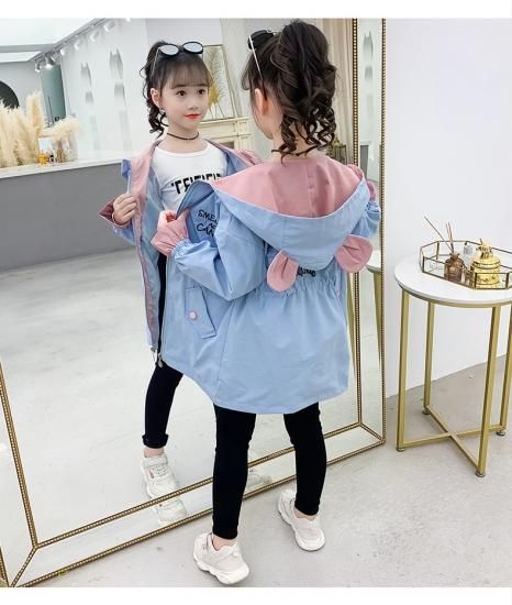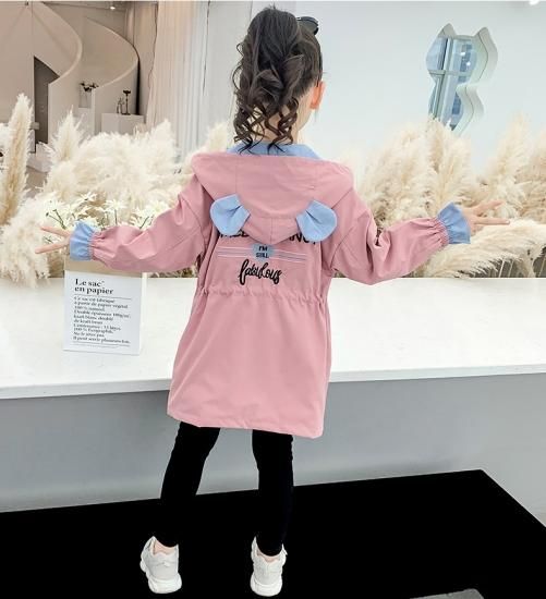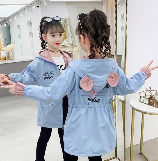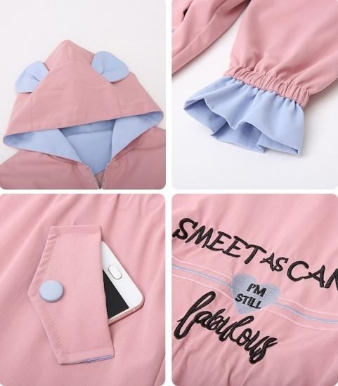 ウィンドブレーカー ガールズ レディース 女の子 子供用 カラバリ 2色 ピンク ブルー 春 秋冬 新作 ミドル丈 フロントジッパー フード付き ロゴ 耳付きフード ウエスト絞り ポケット 可愛い