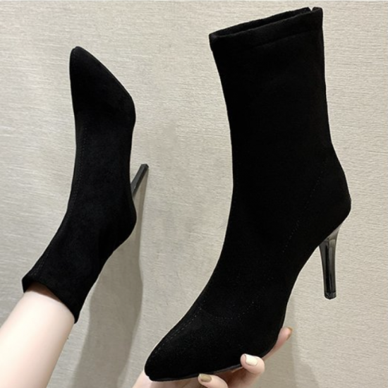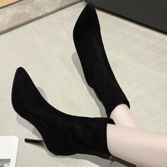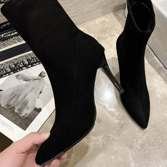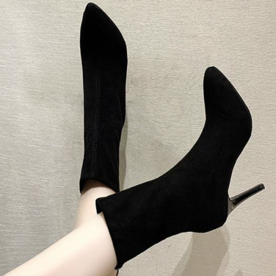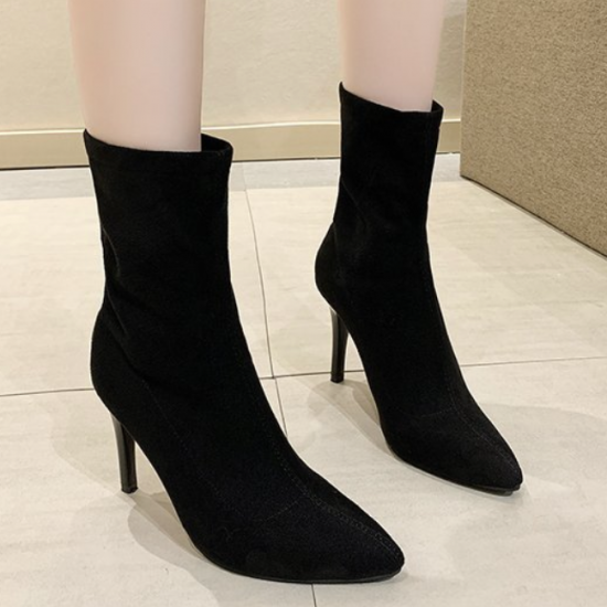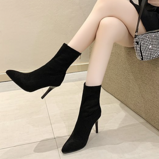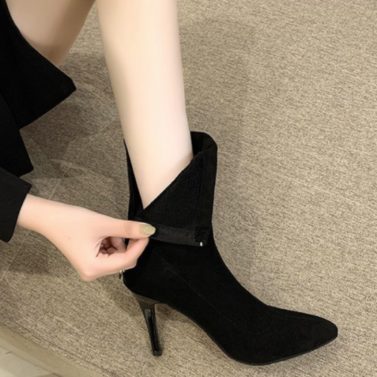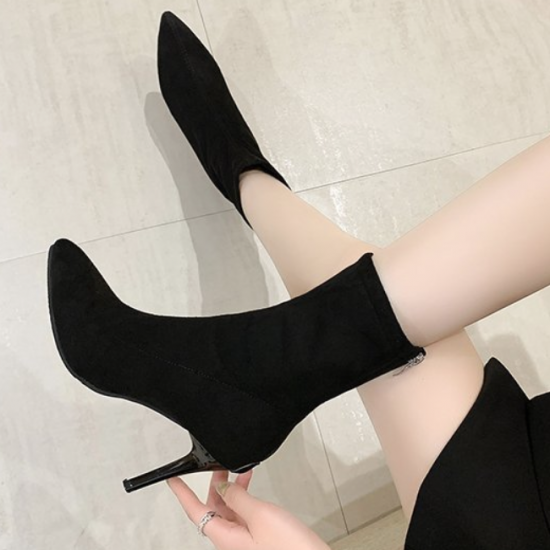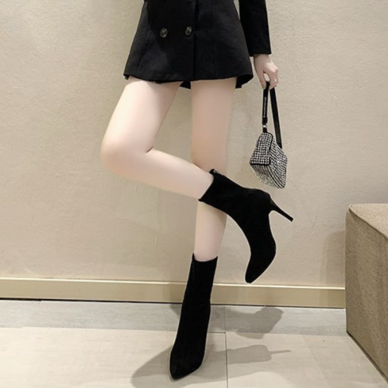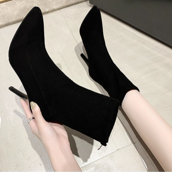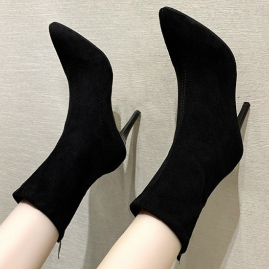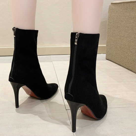シューズ アンクルブーツ レディース ショートブーツ ハイヒール 無地 おしゃれ バックジッパー 黒 ブラック 膝下 10cmヒール 無地 スエード ポインテッドトゥ 大きいサイズ かわいい