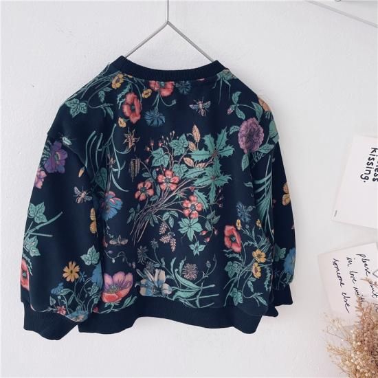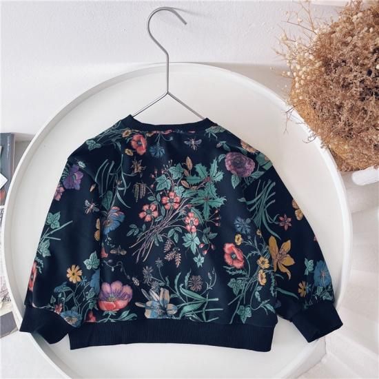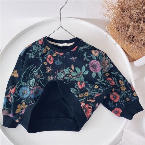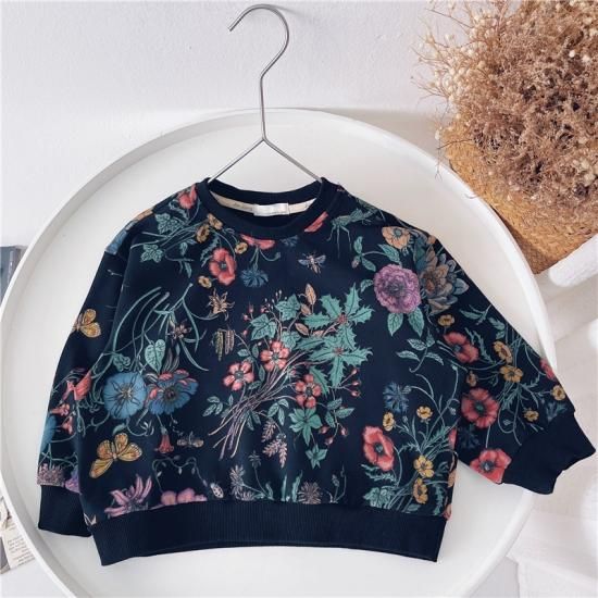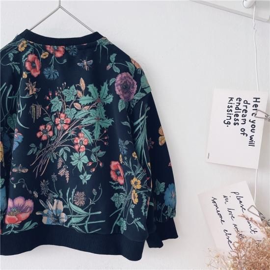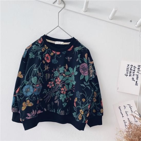 トップス ボーイズ ガールズ キッズ ブラック サイズ2展開 140 150 プルオーバー コットン 春 秋冬 新作 カジュアルスタイル おしゃれ 総柄 ラウンドネック プリント 子供用 可愛い