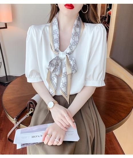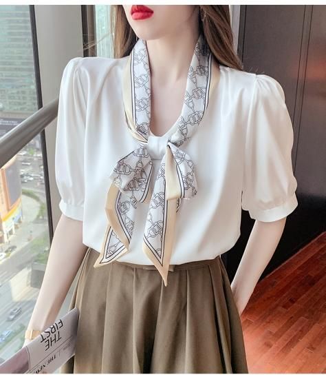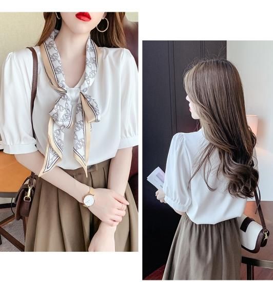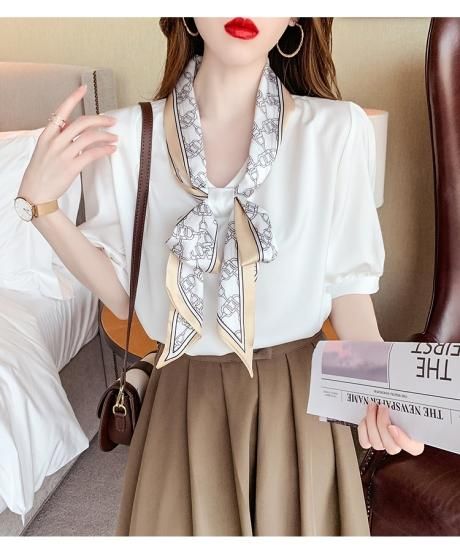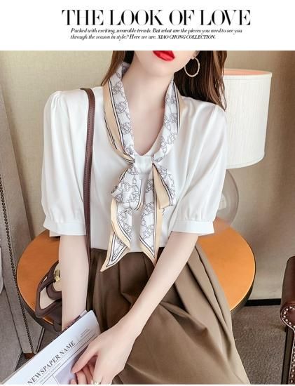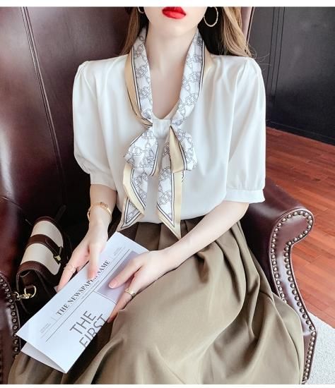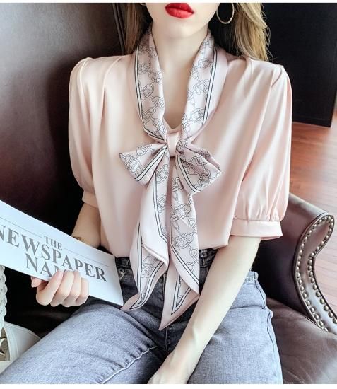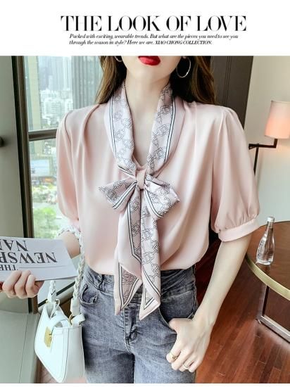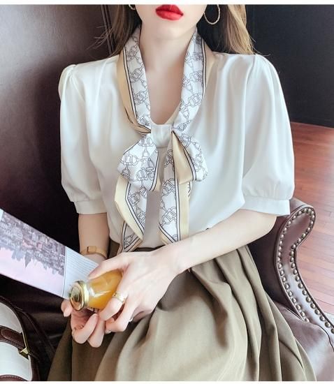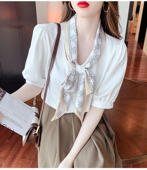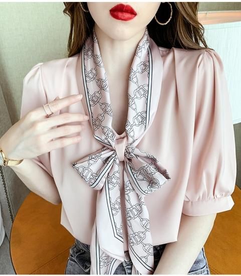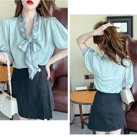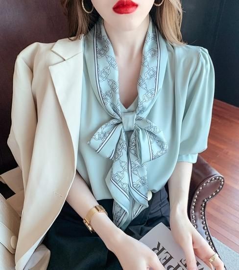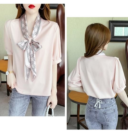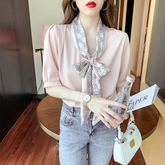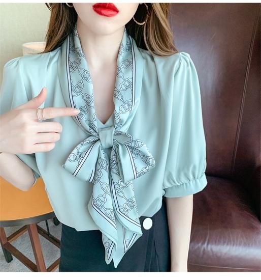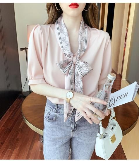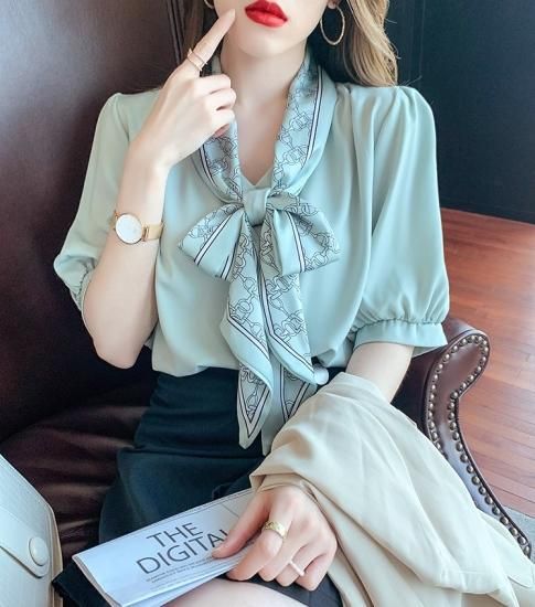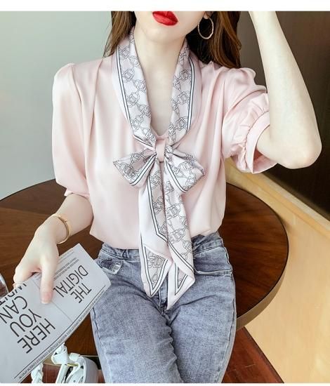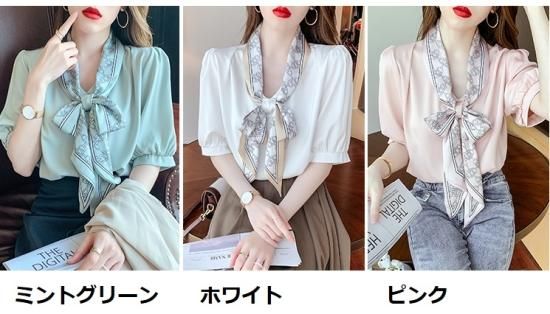 半袖ブラウス レディース カラバリ3色 ミントグリーン ホワイト ピンク 半袖 ブラウス パフスリーブ ボウタイシャツ シフォンシャツ きれいめ エレガントスタイル サイズ4展開 S M L XL