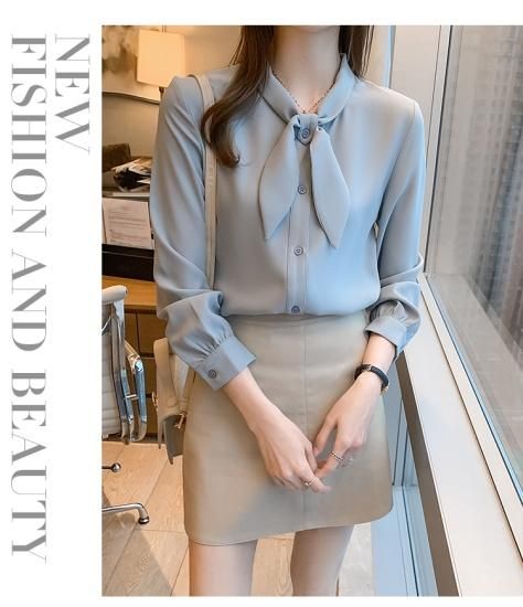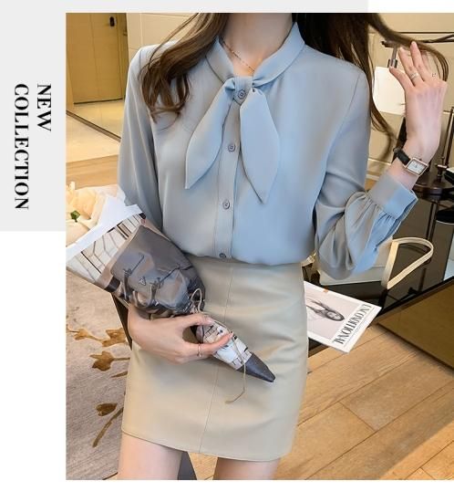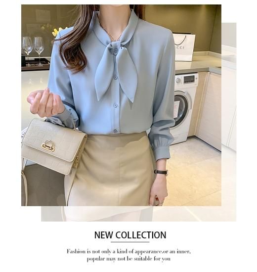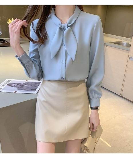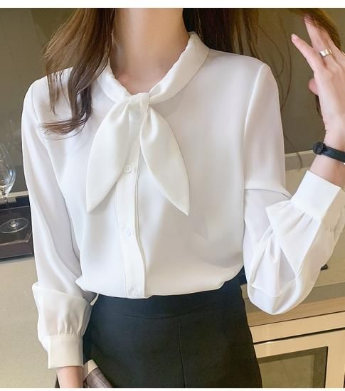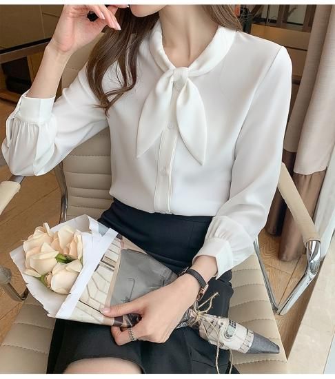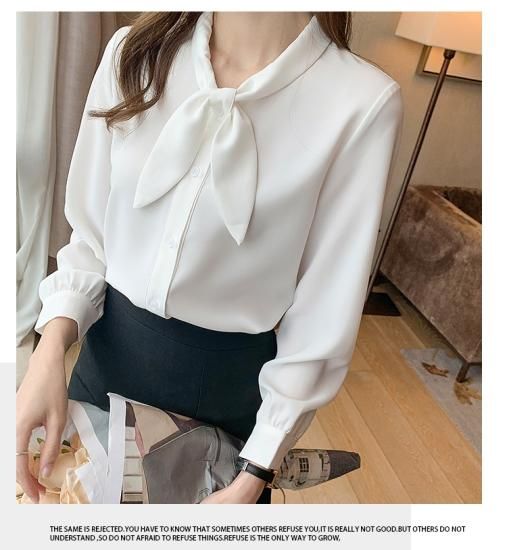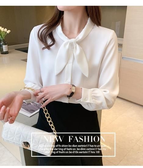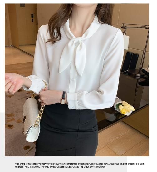 シフォンシャツ レディース カラバリ2色 ホワイト ブルー 長袖 シャツ 長袖シャツ ボウタイシャツ フロントボタン エレガントスタイル オフィススタイル サイズ5展開 S M L XL 2XL