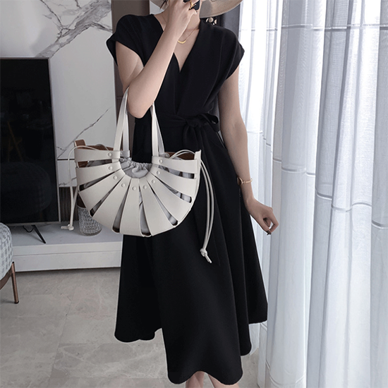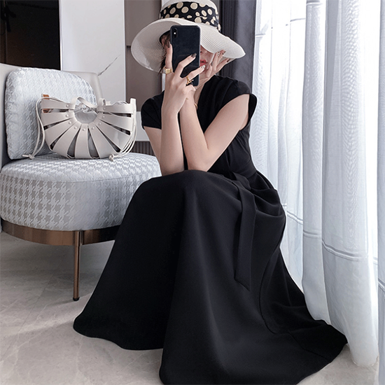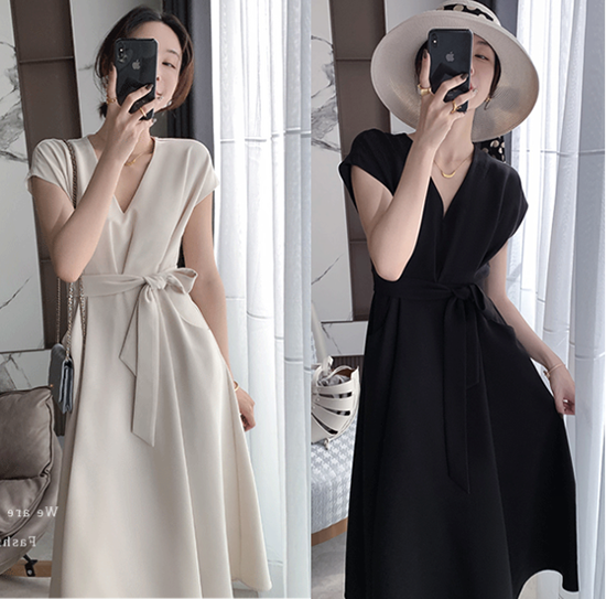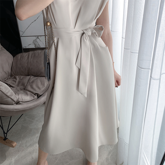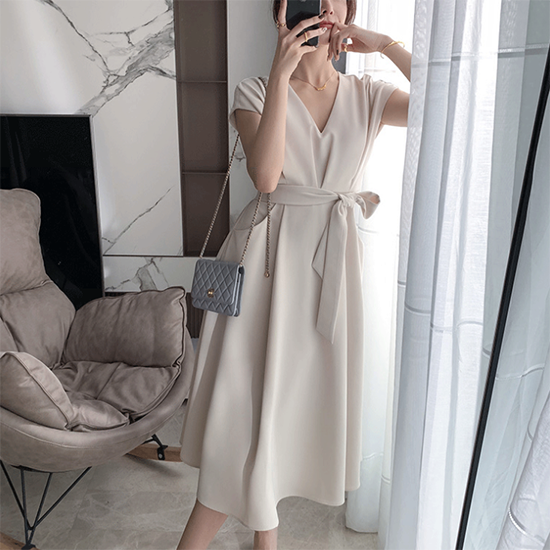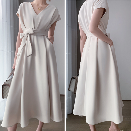 ワンピース 半袖 ロング Aライン フレア Vネック レディース ロングワンピ ミモレ丈 無地 ウエストリボン きれいめ ポケット ハイウエスト フレンチ袖 レディース フレアスカート エレガント