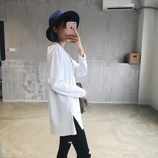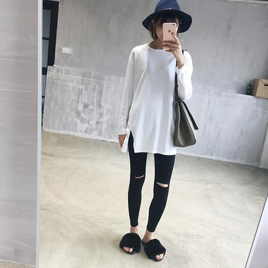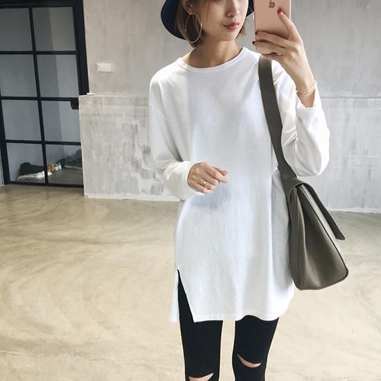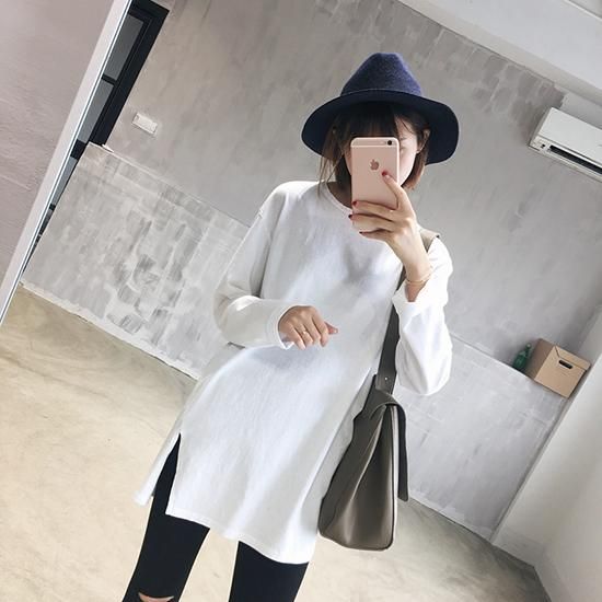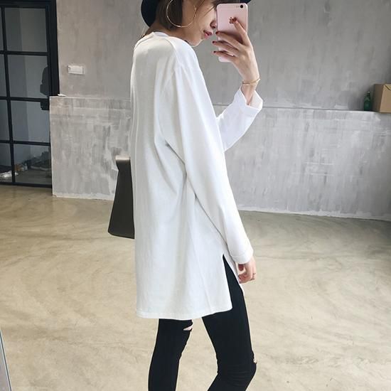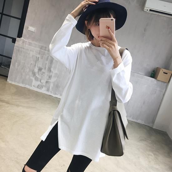 Tシャツ ロングTシャツ 長袖 サイドスリット トップス レディース クルーネック 無地 綿 コットン シンプル カジュアル オーバーサイズ 大きいサイズ ロング ロンT トップス レディース