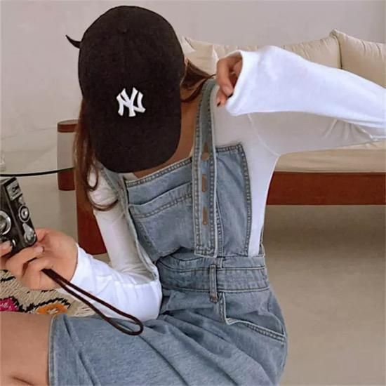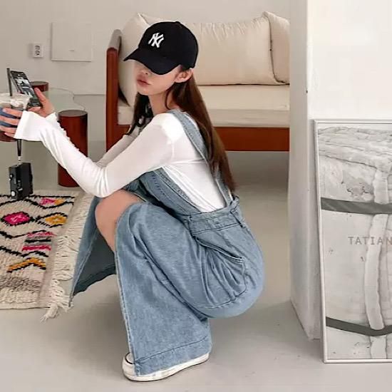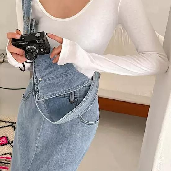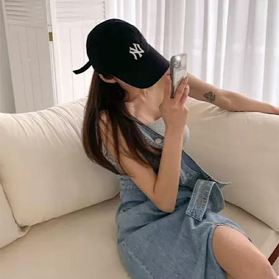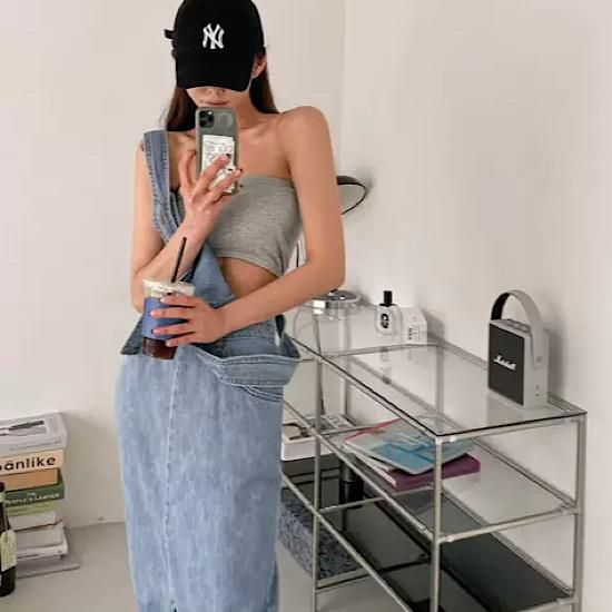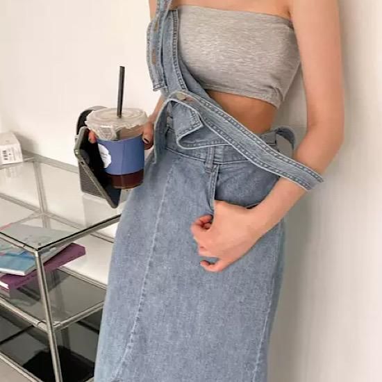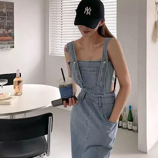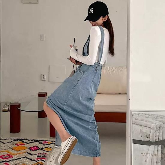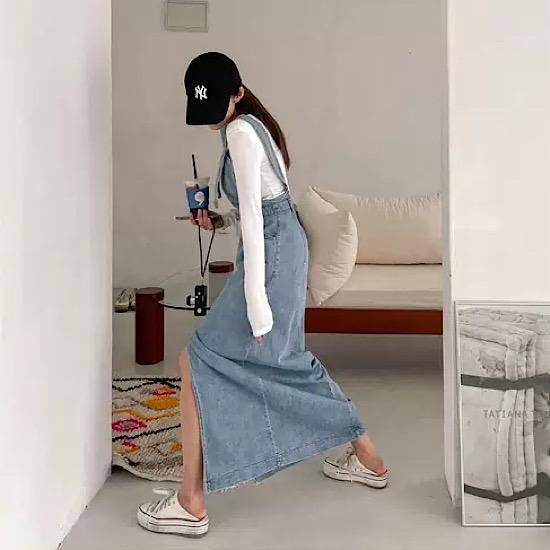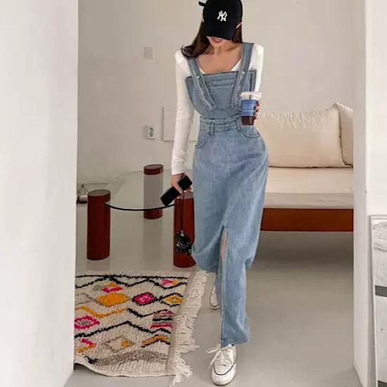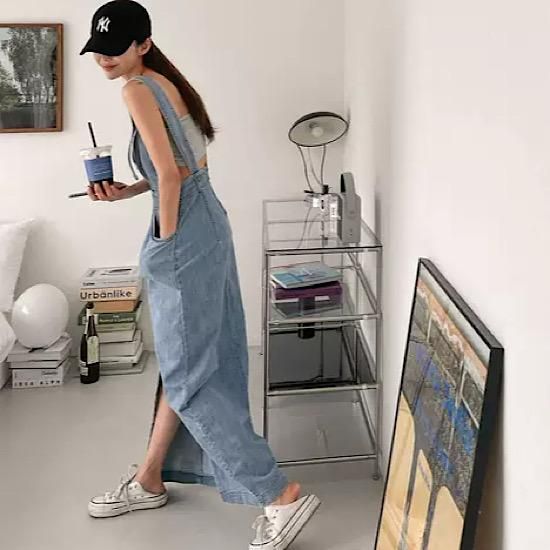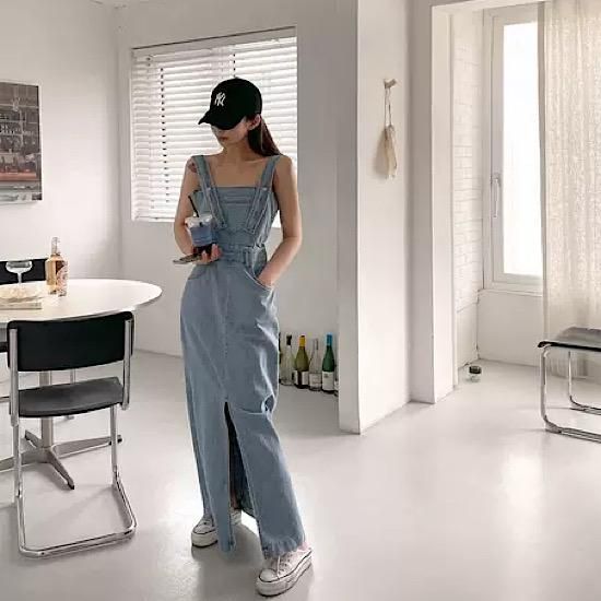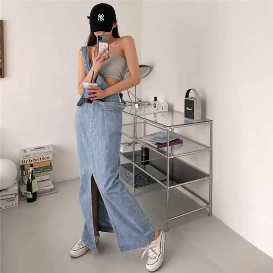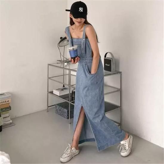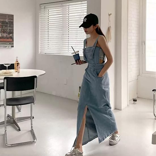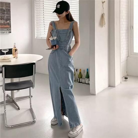 ワンピース デニムサスペンダー ハイウエスト ノースリーブ ロング丈 プルオーバー 前スリットレディース 無地 体型カバー 夏 春 新作 カジュアル 大人スタイル スプリングウェア