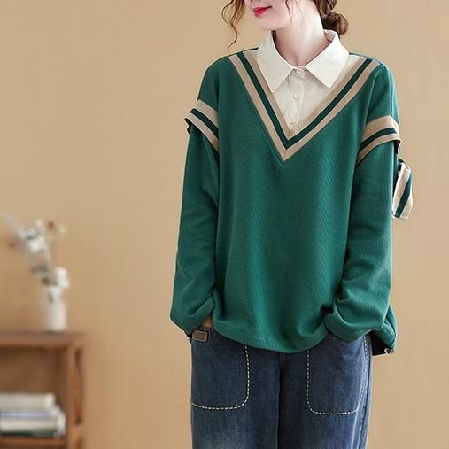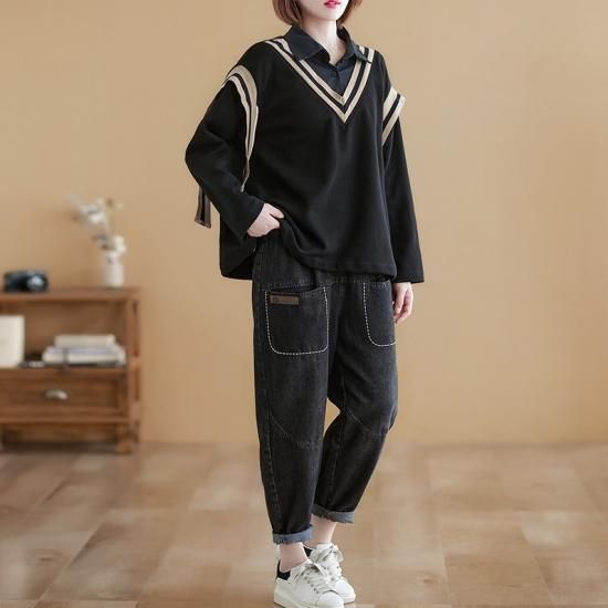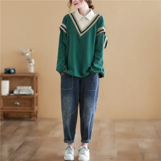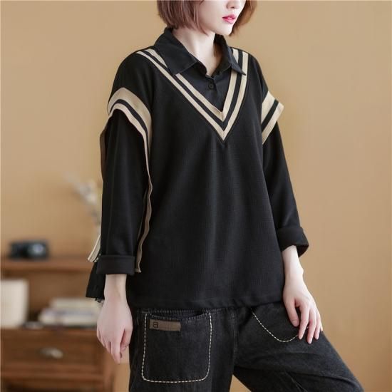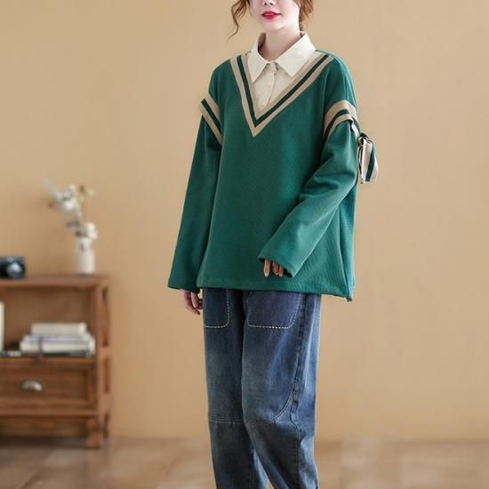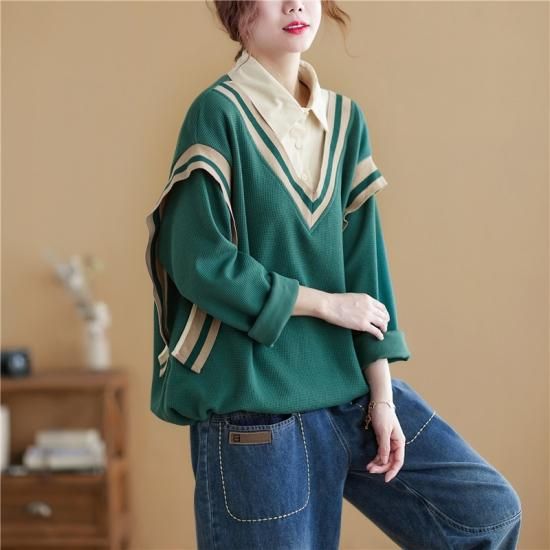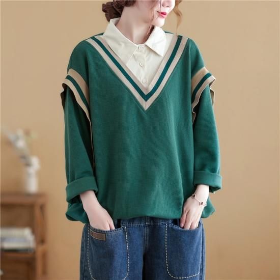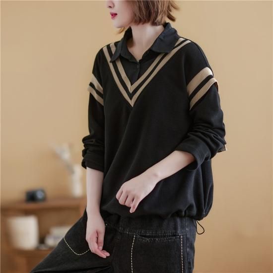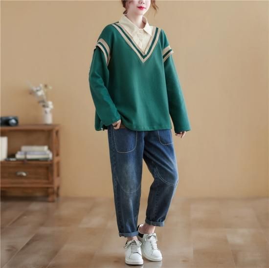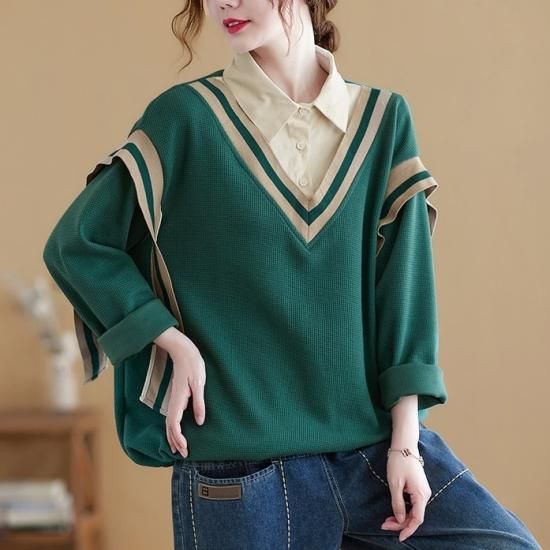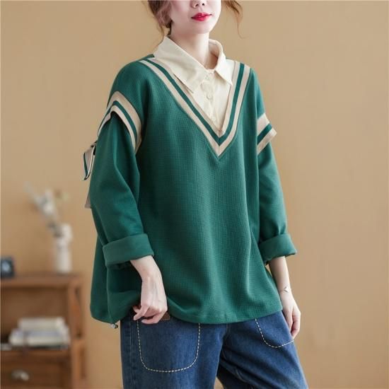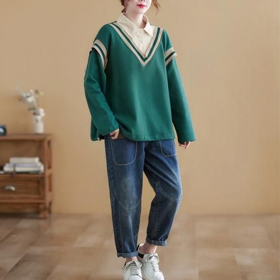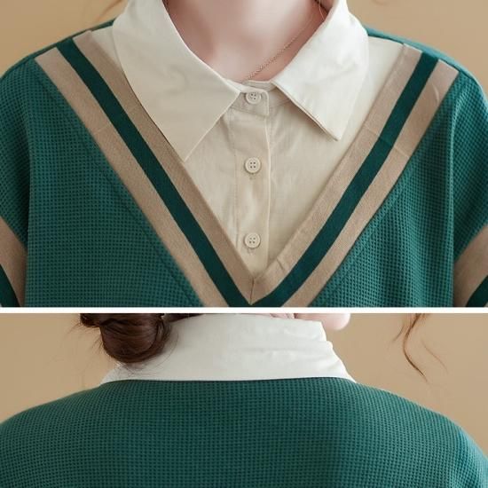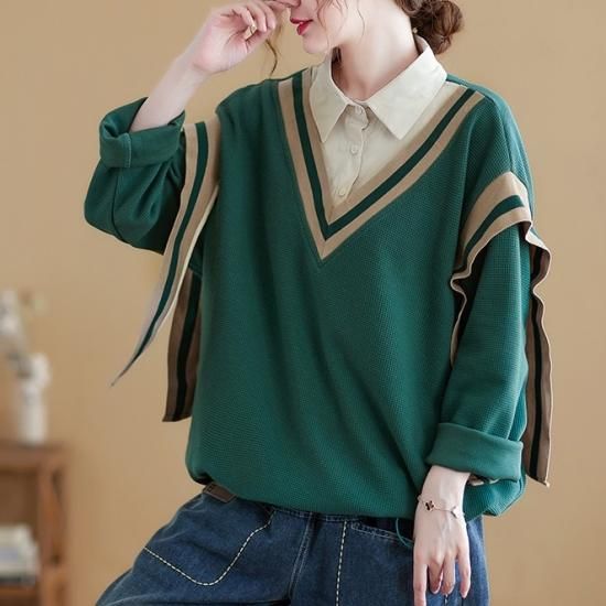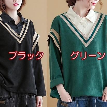 プルオーバー シャツ フェイクレイヤード レディース 韓国 ファッション アンサンブル Vネック シャツ ワイドシルエット オーバーサイズ ビッグサイズ Aライン スポーツミックス 大人カジュアル