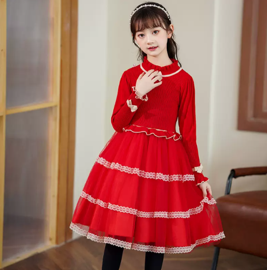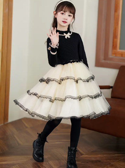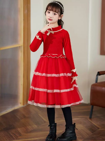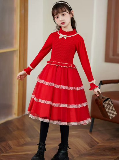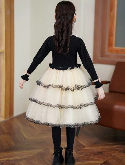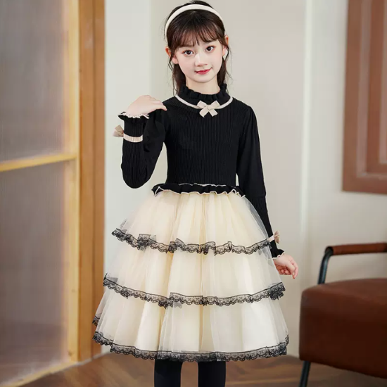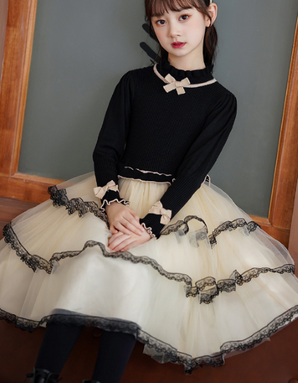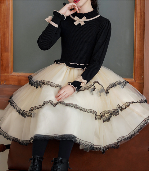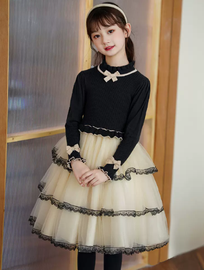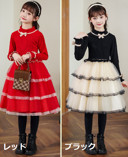 卒園式 子供服 ワンピース 女の子 キッズ ガールズ 長袖 ハイネック 異素材 ティアードスカート リボン プリンセス 入園式 入学式 発表会 お呼ばれ おしゃれ 可愛い レース コントラストカラー