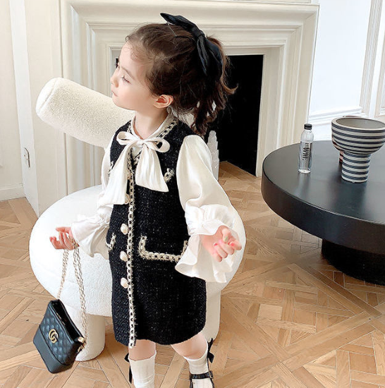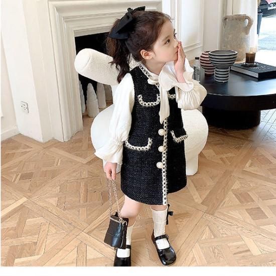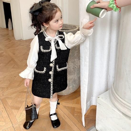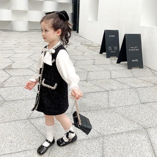 卒園式 子供服 ワンピース 長袖 リボン パールボタン ステッチ 女の子 キッズ ガールズ 可愛い お出かけ フォーマル 入園式 入学式 重ね着風 フェイクツーピース ウール コントラストカラー
