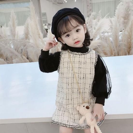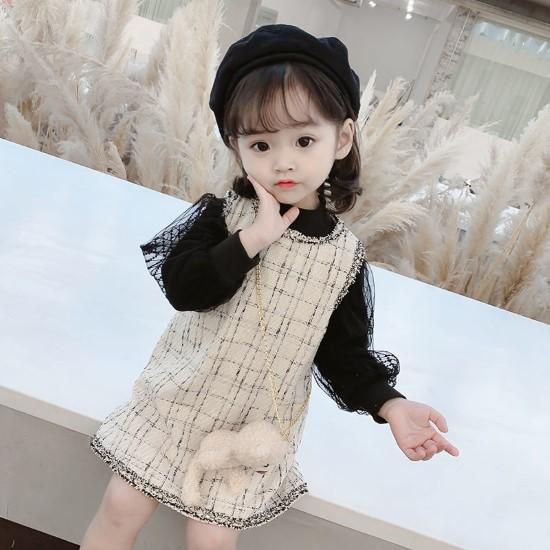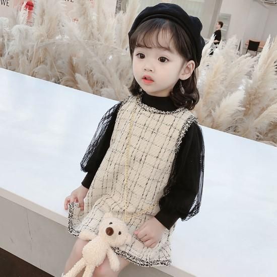卒園式 子供服 ノースリーブワンピース インナー トップス 2点セット ツーピース くま付き ベア チェック柄 ガールズ 女の子 キッズ レース ふんわり袖 長袖インナー ハイネック 入園式 入学式