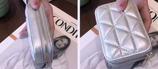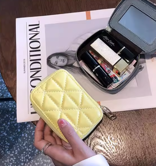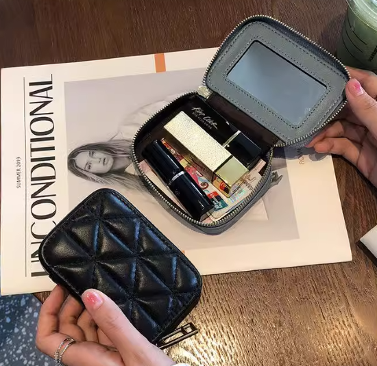 メイクポーチ レディース 化粧ポーチ ミラー付き ファスナーポーチ コンパクト キルティング マルチポーチ コスメポーチ 牛革 レザー ミニポーチ 鏡 ステッチ シンプル 無地 エレガント 女性