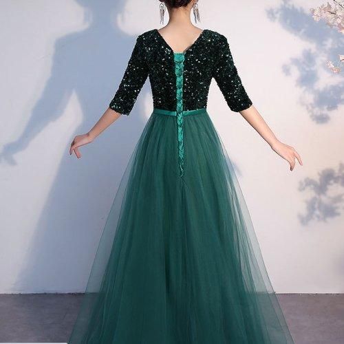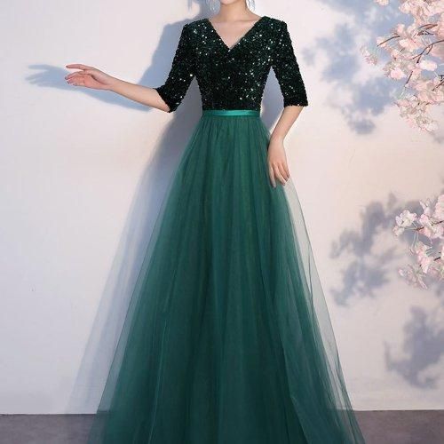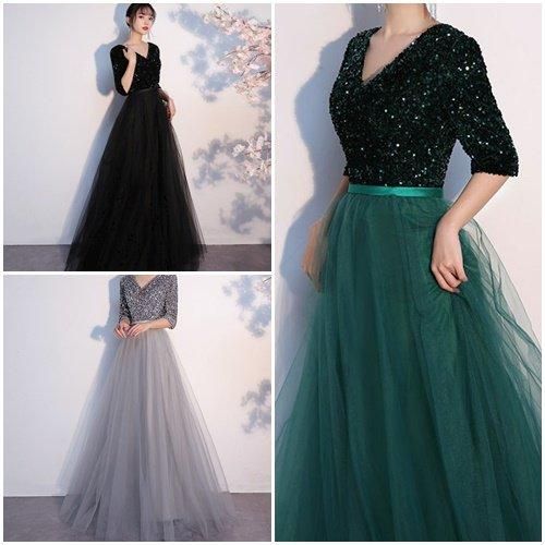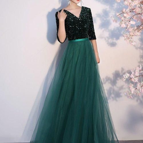 演奏会ドレス 発表会 お呼ばれ パーティー 結婚式 二次会 Vカット スパンコール Aライン マキシ丈 エレガント 五分袖 大きいサイズ 演奏会ドレス 発表会 お呼ばれ パーティー 結婚式 二次会