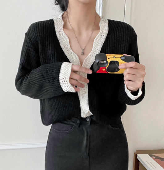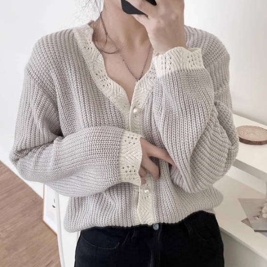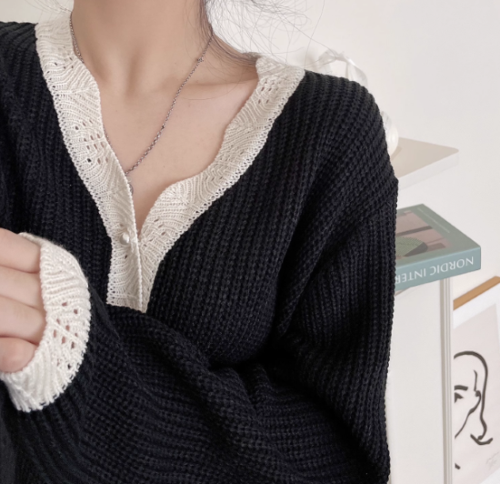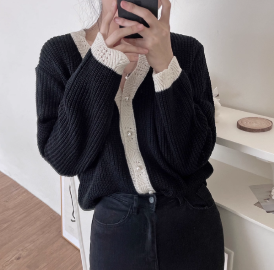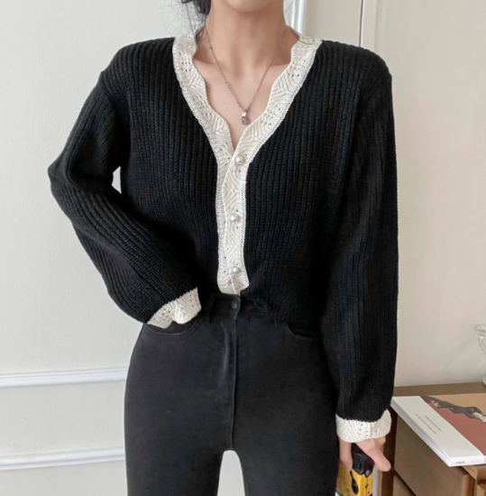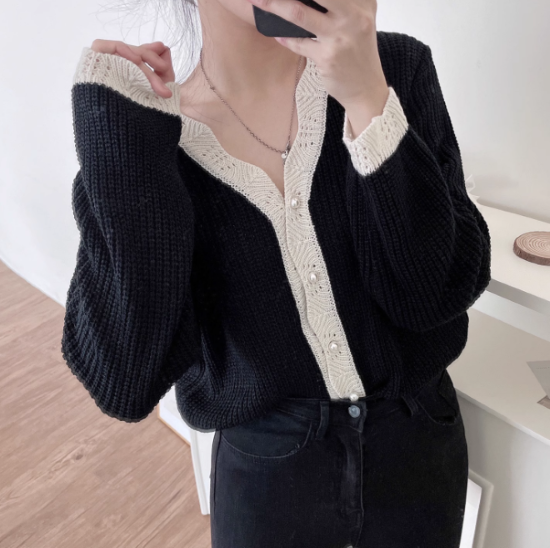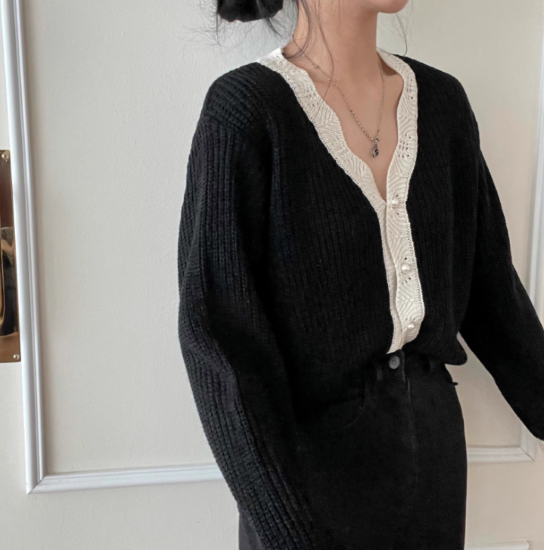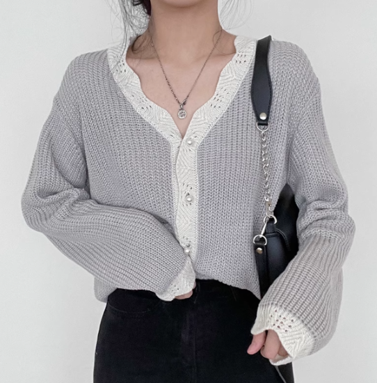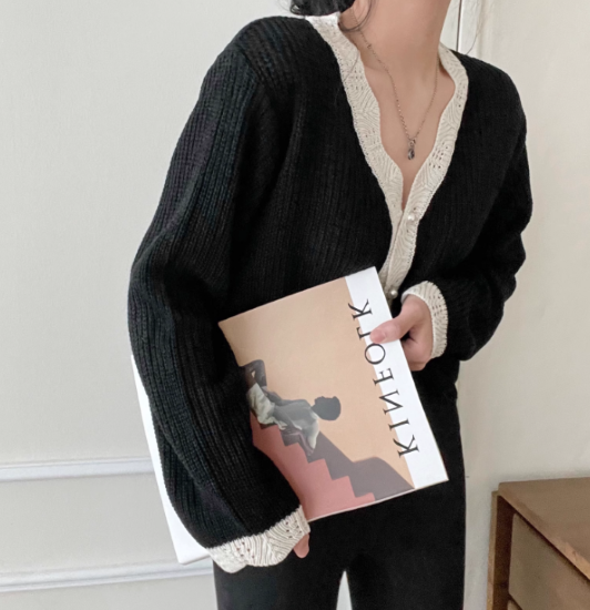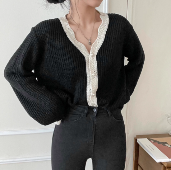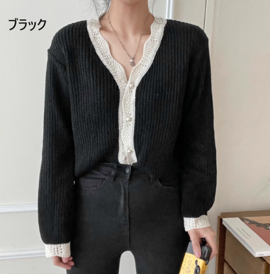 ニットセーター レディース トップス ニットカーディガン 羽織 フロントボタン パールボタン Vネック 長袖 レース ゆったり ルーズ ガーリー カジュアル お出かけ おしゃれ ファッション 女性