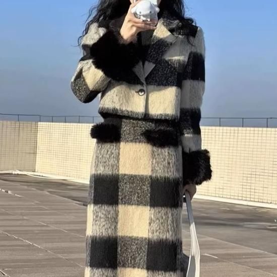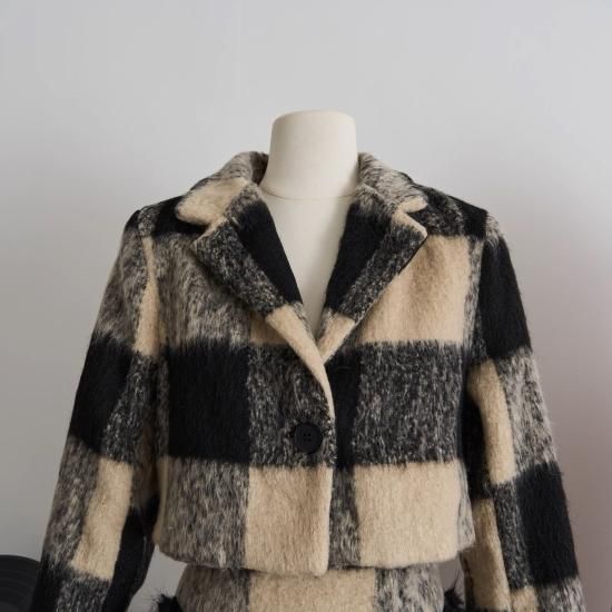 セットアップ レディース チェック柄 ツーピース ショートジャケット テーラードジャケット クロップド丈 タイトスカート ロングスカート ミモレ丈 ファー付き きれいめ ガーリー 上下 おしゃれ