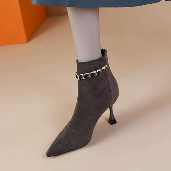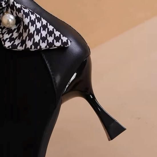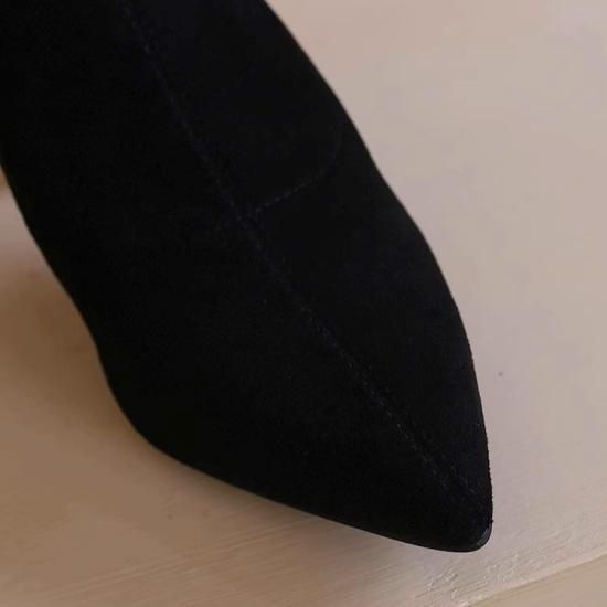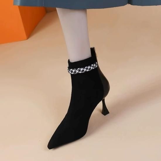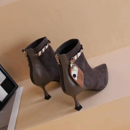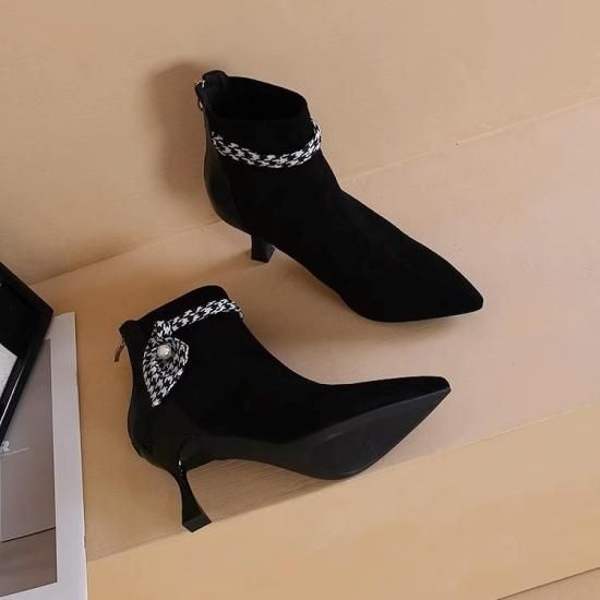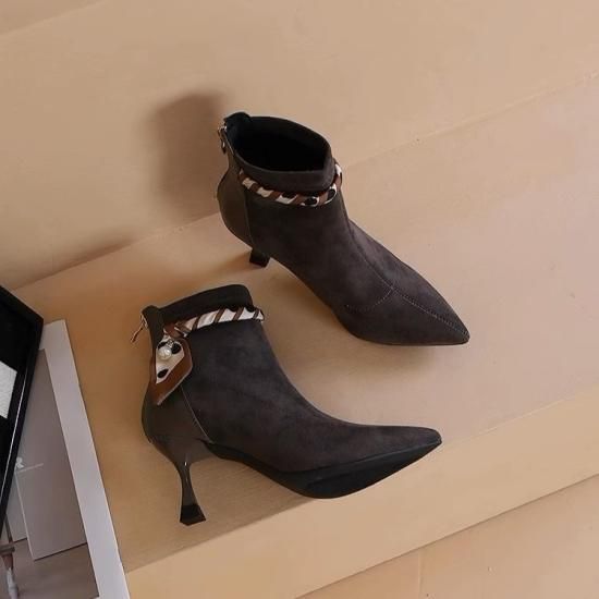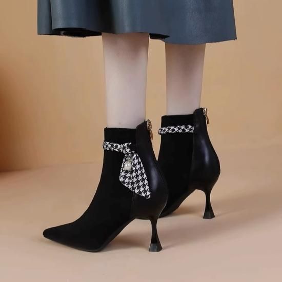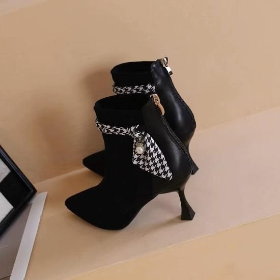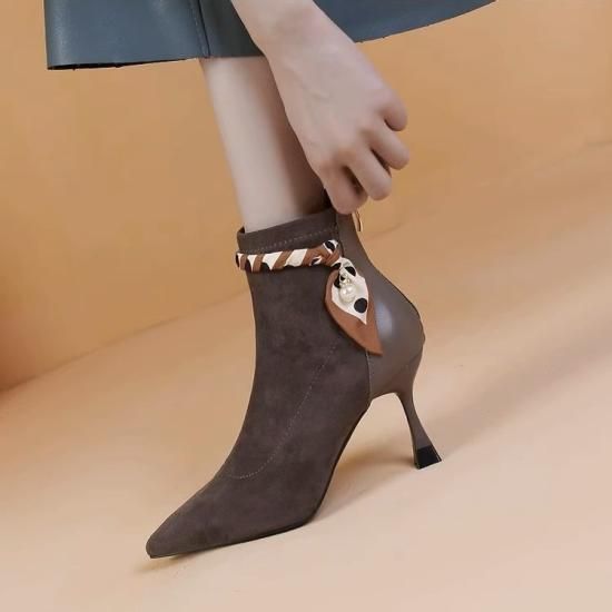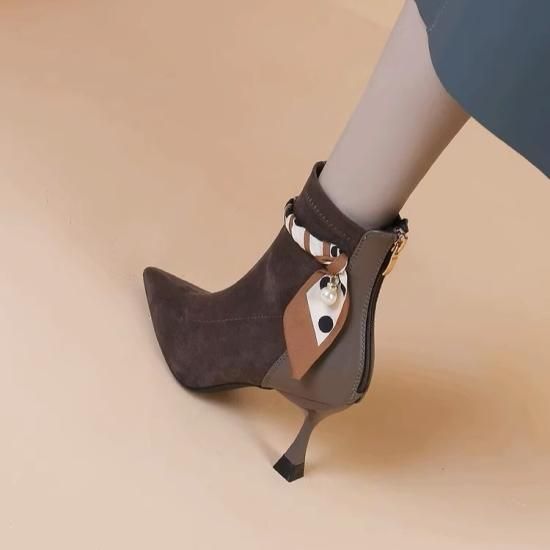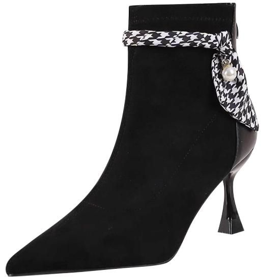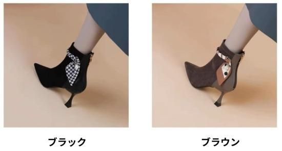ショートブーツ レディース アンクルブーツ スエード ポインテッドトゥ フェイクレザー 7cmヒール スカーフ リボン パール バックファスナー きれいめ エレガント 異素材MIX 美脚 おしゃれ