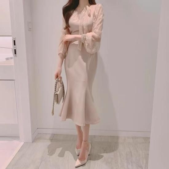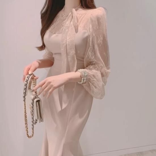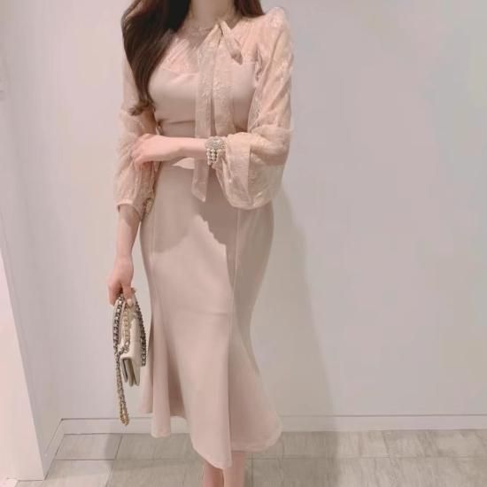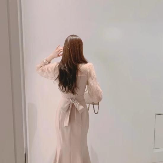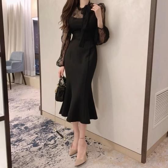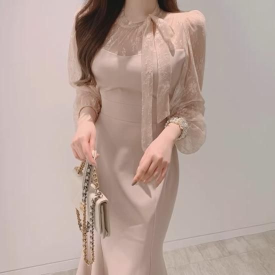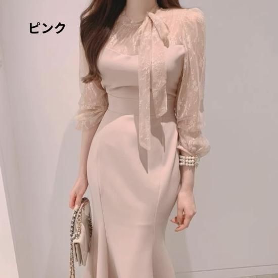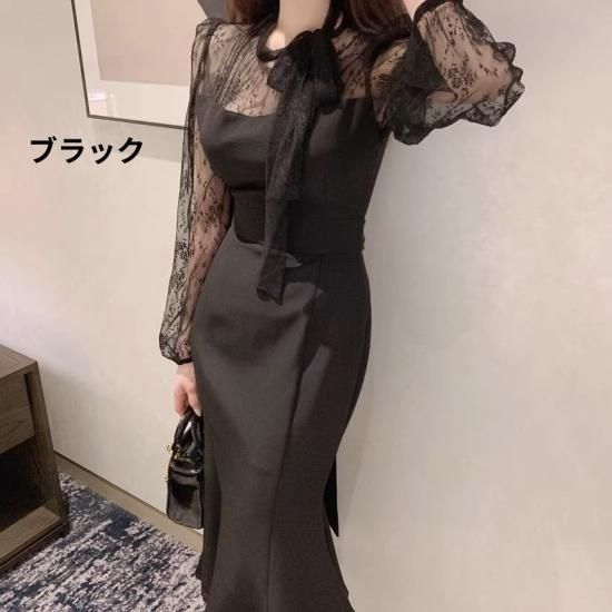 パーティードレス レディース マーメイド シースルー シアースリーブ 花柄レース タイト ワンピース リボンネック 長袖 2color エレガント 結婚式 演奏会 披露宴 謝恩会 二次会 おしゃれ