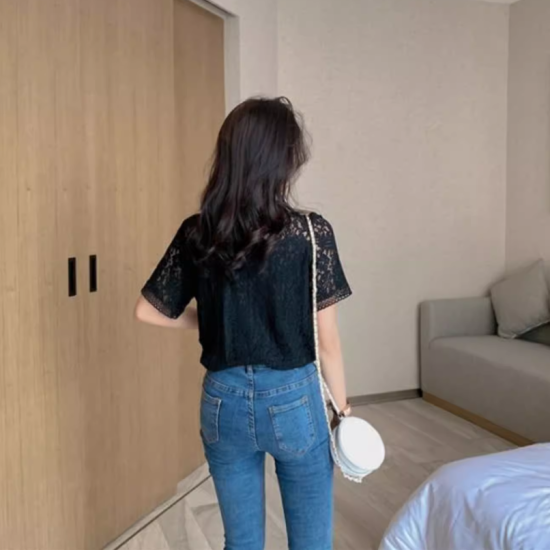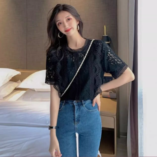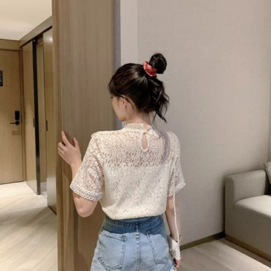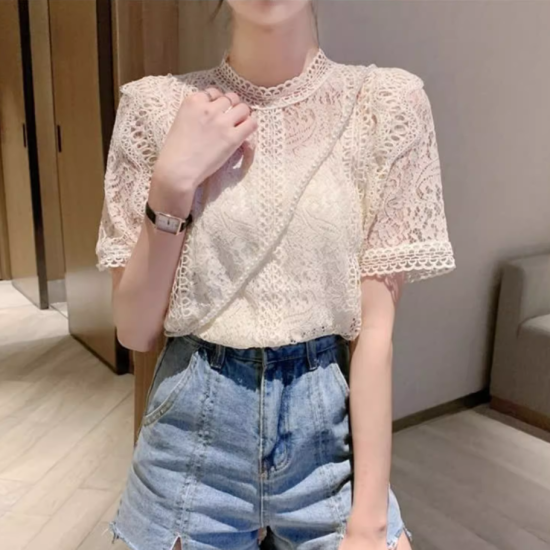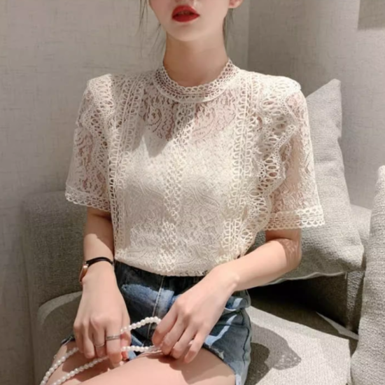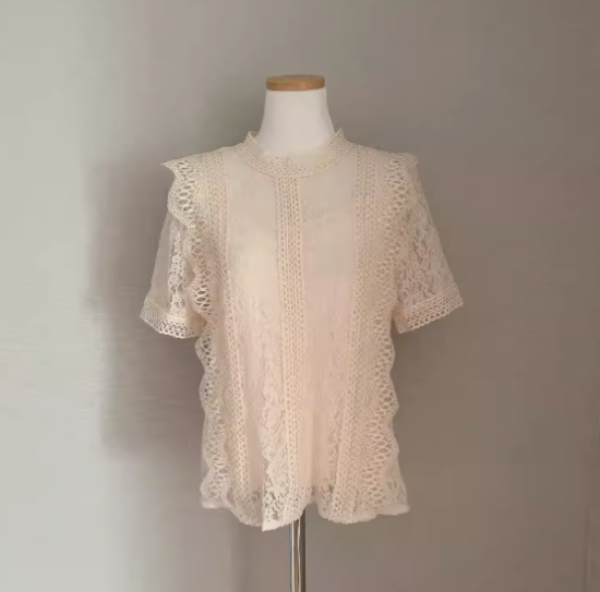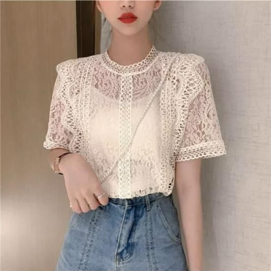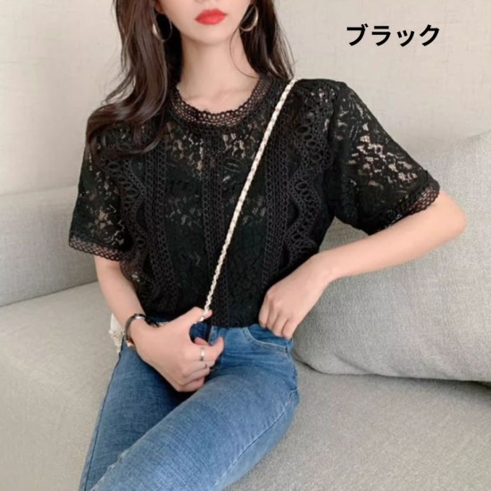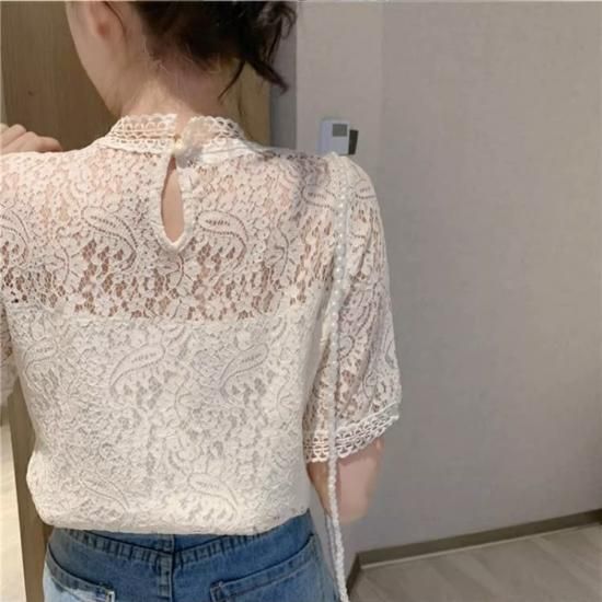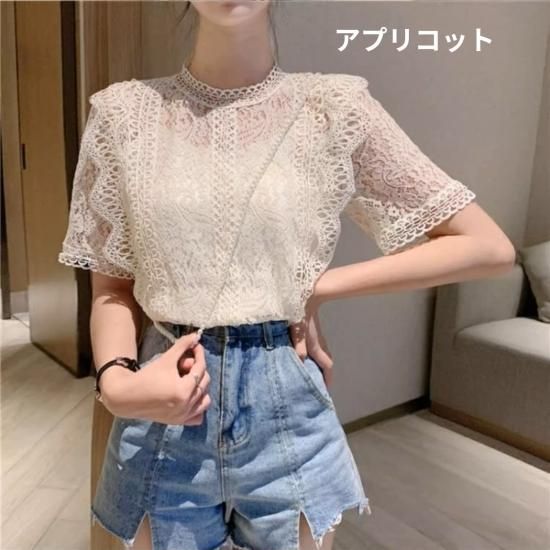 レースブラウス レディース 半袖 プルオーバー シャツ ラウンドネック ハイネック 総レース フリル フェミニン レトロ クラシカル 2color きれいめ ガーリー おでかけ オフィス おしゃれ