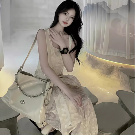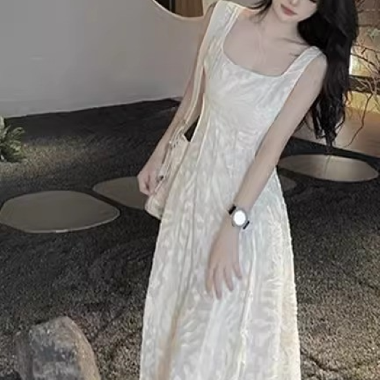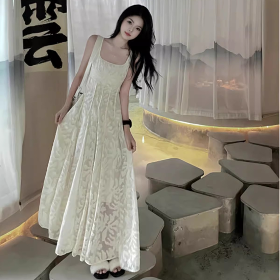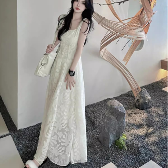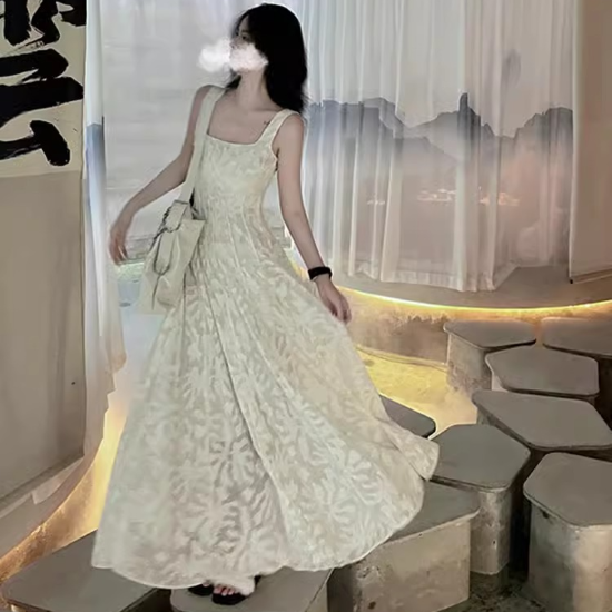 キャミソールワンピース ジャガード レディース ロング丈 マキシ丈 キャミワンピ フレア ギャザー ドレス パーティードレス パーティー ロングスカート ロングワンピ ホワイト スクエアネック