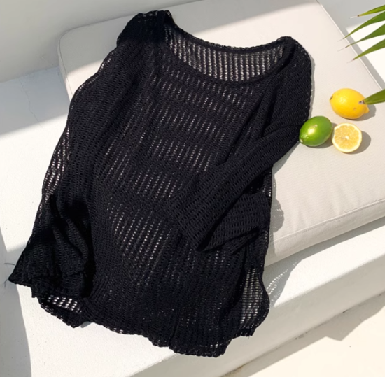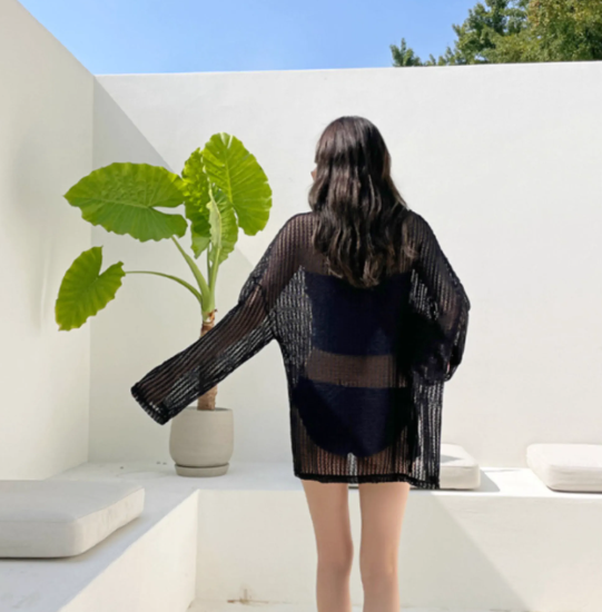 カバーアップ レディース トップス スイムウェア ビーチウェア プルオーバー 長袖 メッシュ 日焼け防止 UV対策 体型カバー ブラック 黒 シンプル 無地 ゆったり 海 ビーチ 夏 バカンス プール