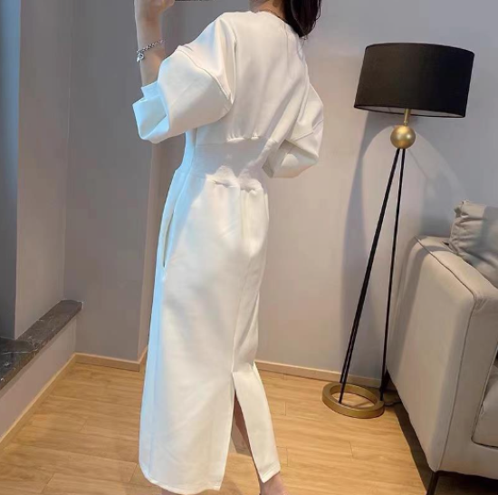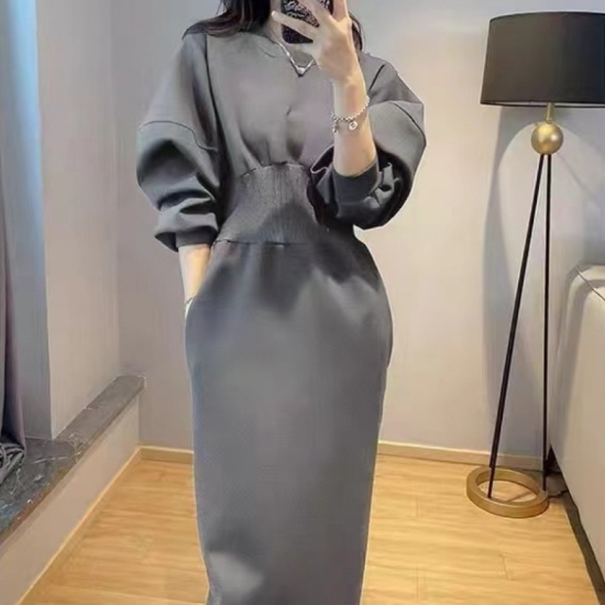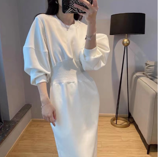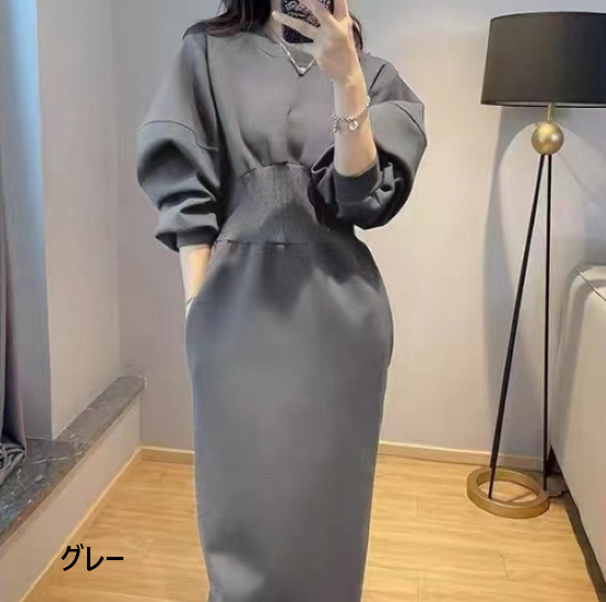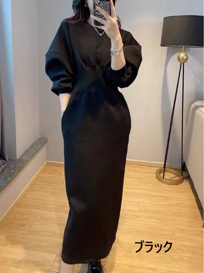 スウェットワンピース レディース ワンピース ロングワンピース パフスリーブ ボリューム袖 ハイウエスト ウエストマーク ラウンドネック シンプル 無地 カジュアル お出かけ おしゃれ プルオーバー