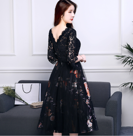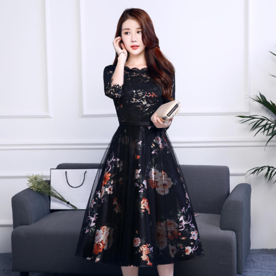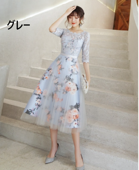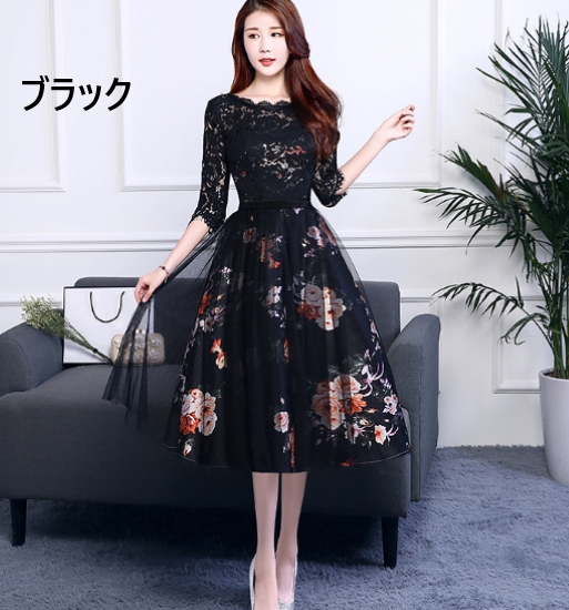 パーティードレス レディース 結婚式ドレス 演奏会ドレス ワンピースドレス ミドル丈 Aラインスカート ハイウエスト 花柄 フラワー レース きれいめ エレガント お呼ばれ フォーマル ファッション