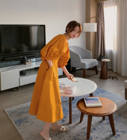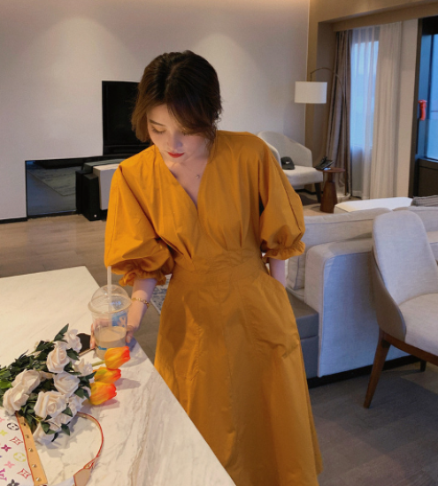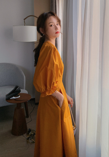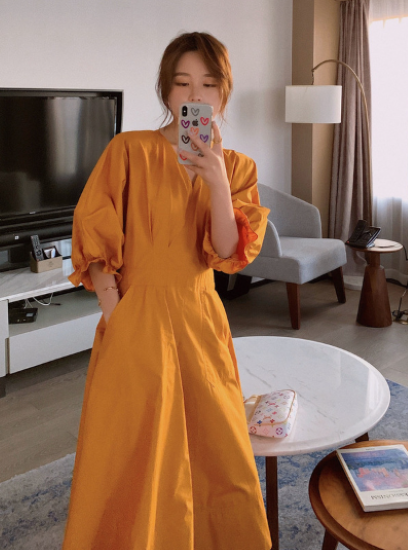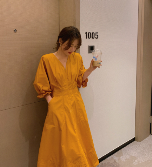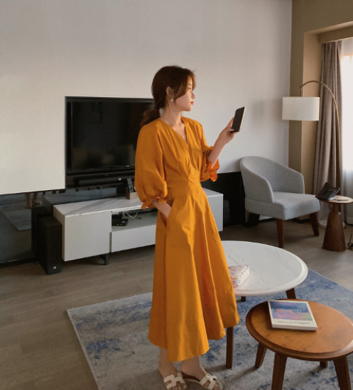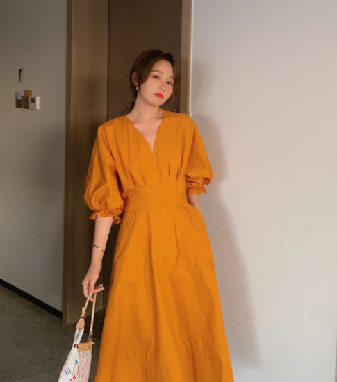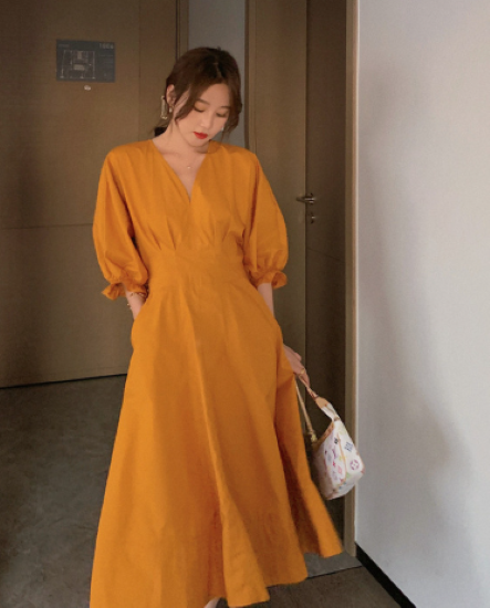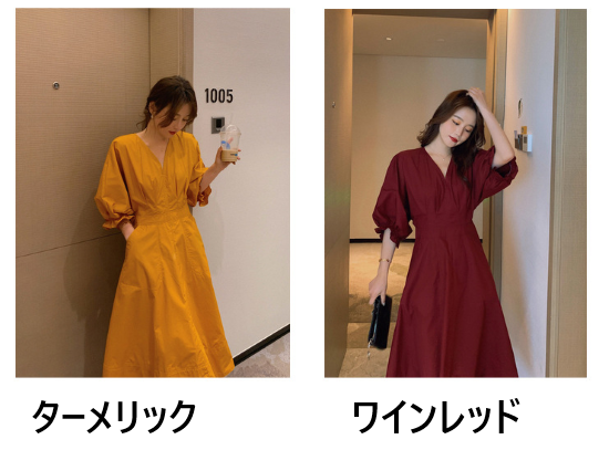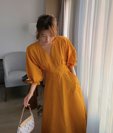 ロングワンピース レディース ワンピース ミモレ丈ワンピース ハイウエスト Vネック ボリューム袖 パフスリーブ ふんわり 袖口フリル コットン 綿 カジュアル お出かけ おしゃれ きれいめ 女性