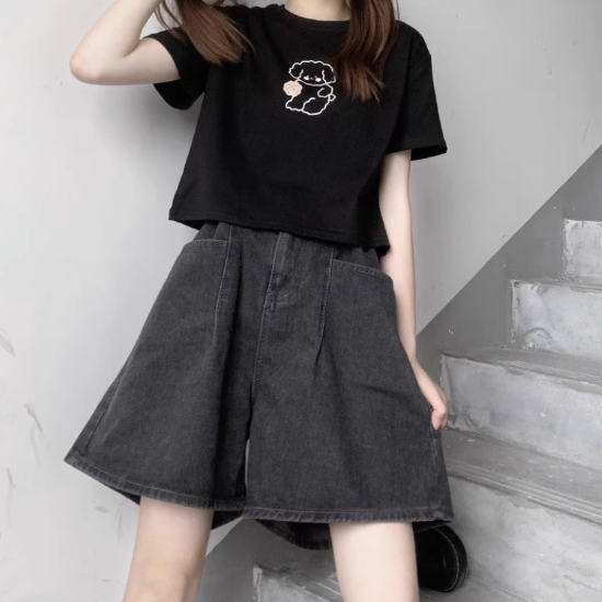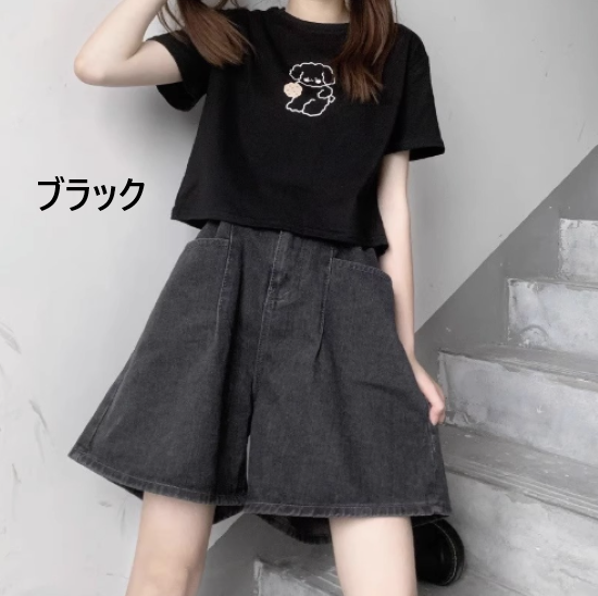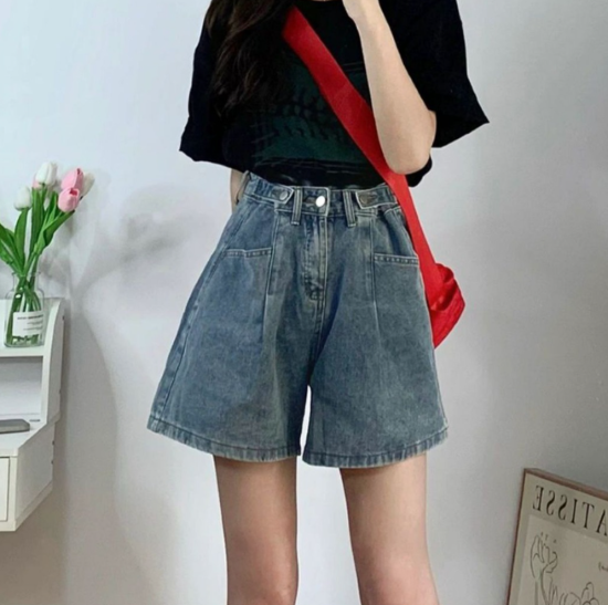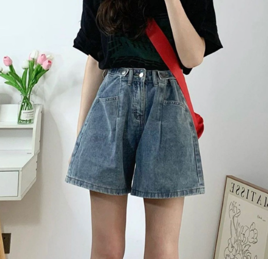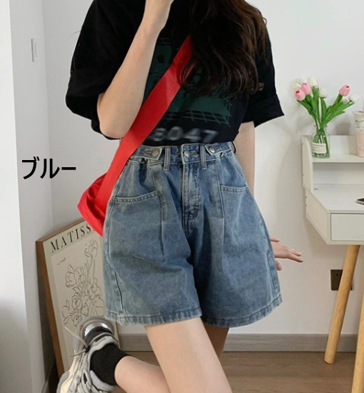 ショートパンツ レディース ボトムス デニムパンツ ショート丈 ハイウエスト Aライン ワイドシルエット シンプル 無地 美脚 脚長 カジュアル お出かけ おしゃれ ファッション ボタン ポケット