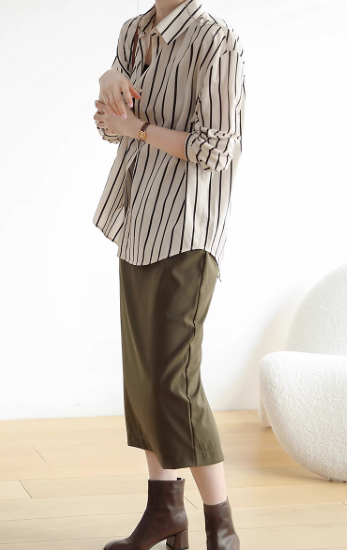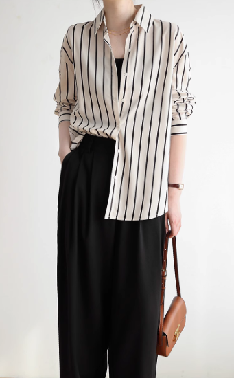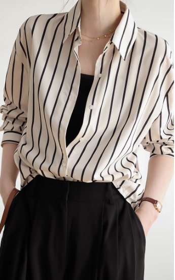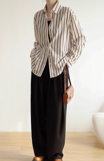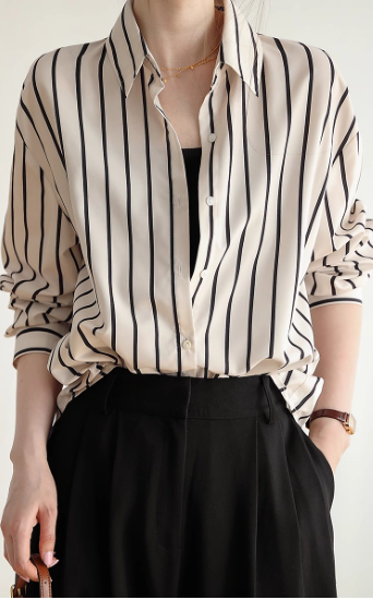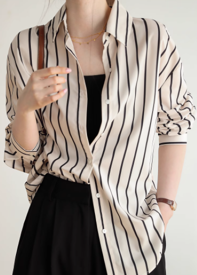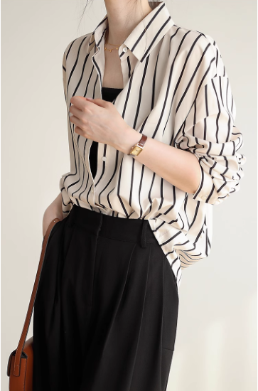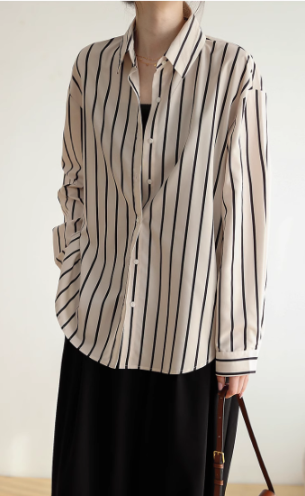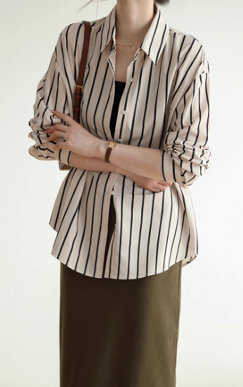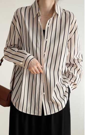 長袖シャツ レディース トップス ブラウス 長め ゆったり 体型カバー フロントボタン ストライプ柄 バイカラー コントラストカラー 襟あり ポロ襟 コットン 綿 羽織 カジュアル お出かけ おしゃれ