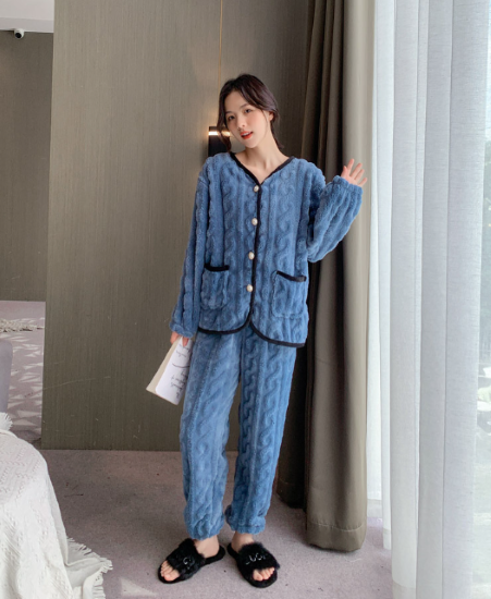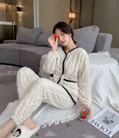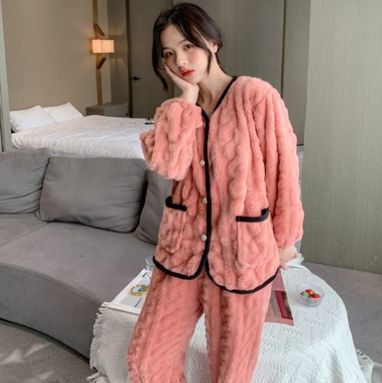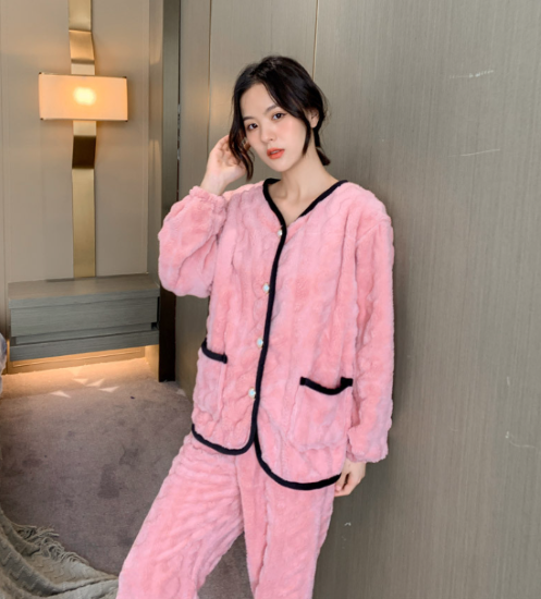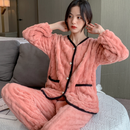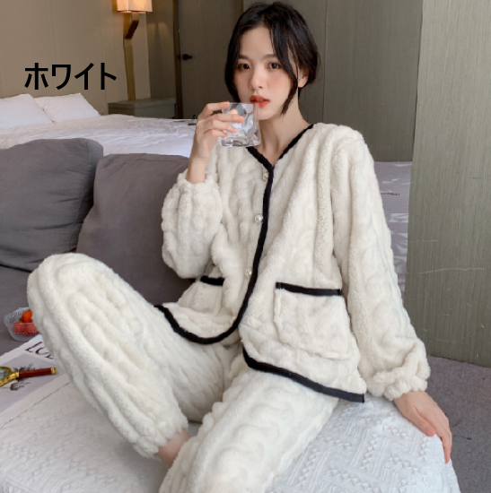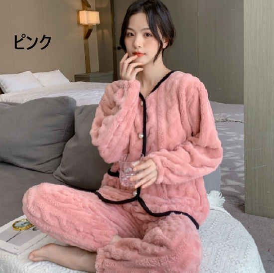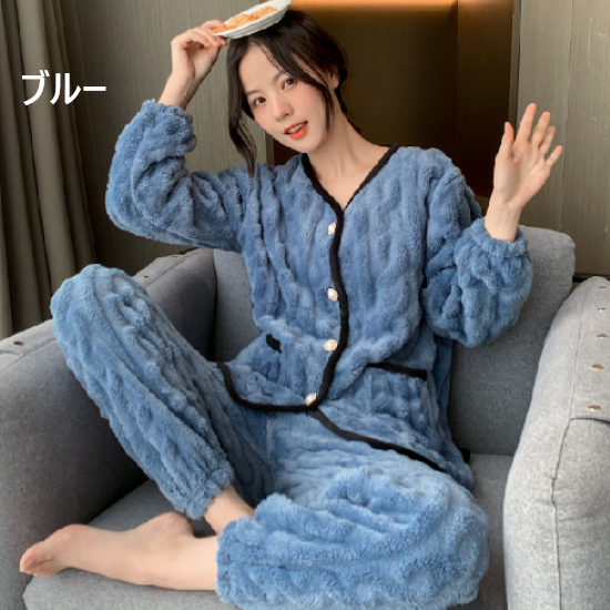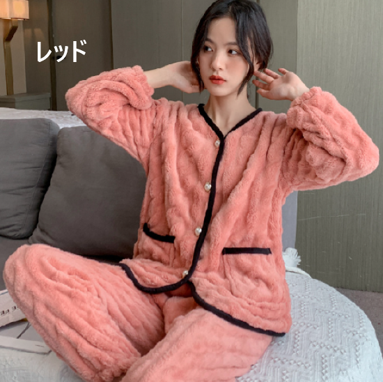 ルームウェア レディース パジャマ 上下セット セットアップ 厚手 ふわふわ もこもこ 暖かい フロントボタン バイカラー Vネック 秋冬 長袖 ゆったり リラックス ホームウェア 部屋着 おうち服