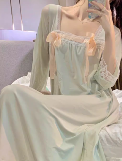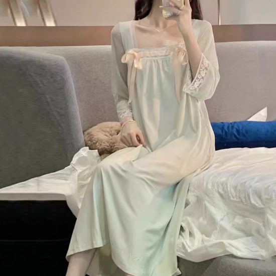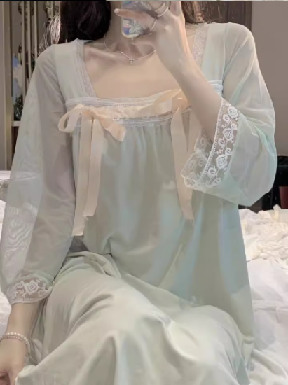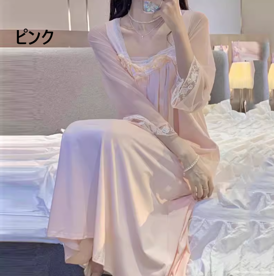 ルームウェア レディース ルームワンピース パジャマ ネグリジェ スウエアネック フェミニン レース リボン ナイトウェア おうち服 リラックス ゆったり ロングワンピース 部屋着 室内着 女性