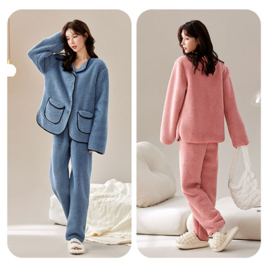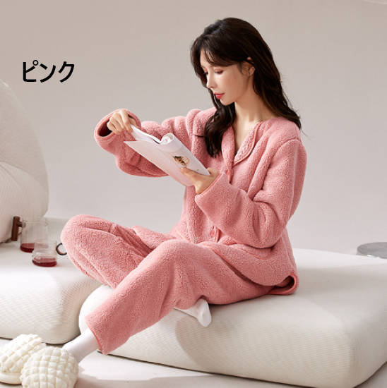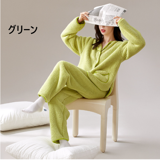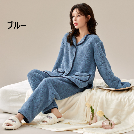 ルームウェア レディース パジャマ 上下セット 長袖 ロングパンツ ふわふわ もこもこ 暖かい 秋冬 襟あり フロントボタン ポケット シンプル 無地 カジュアル リラックス おうち服 ホームウェア