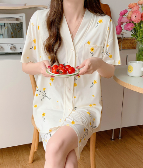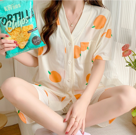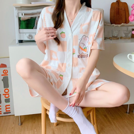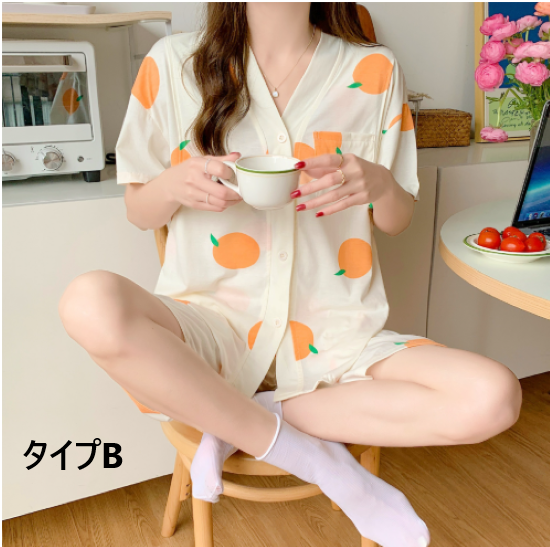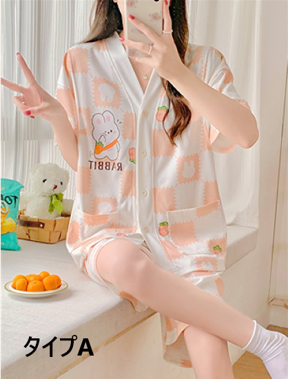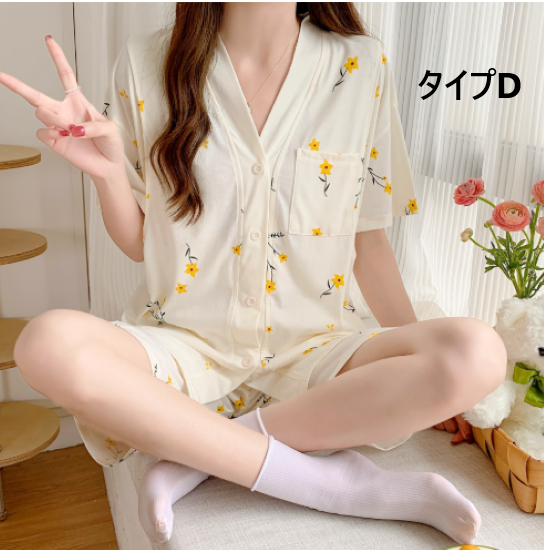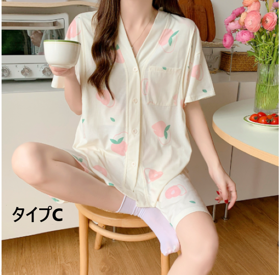 ルームウェア レディース パジャマ ホームウェア ナイトウェア おうち服 上下セット ツーピース 半袖 ショートパンツ 春夏 Vネック プリント キュート 可愛い フロントボタン 部屋着 室内着