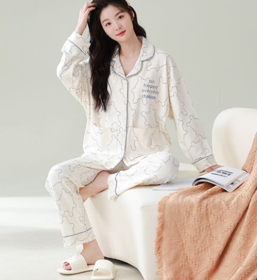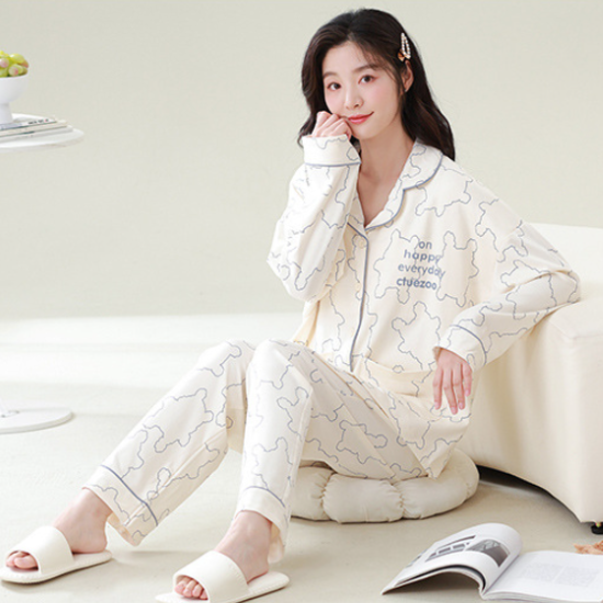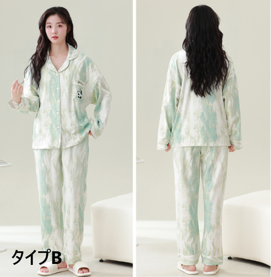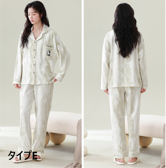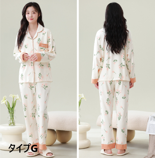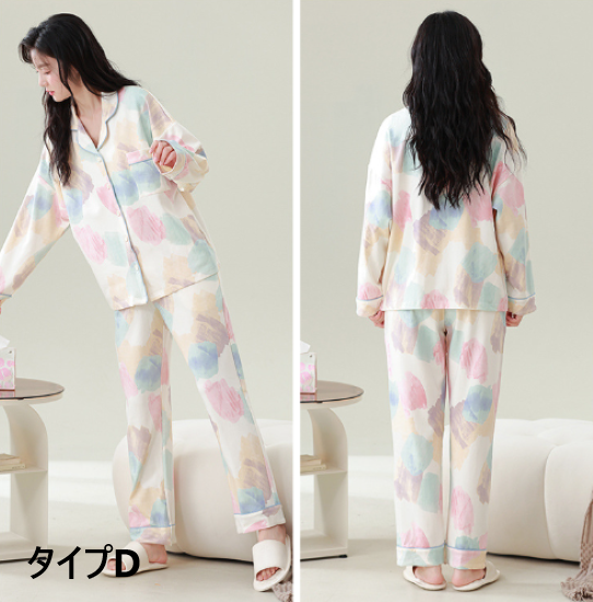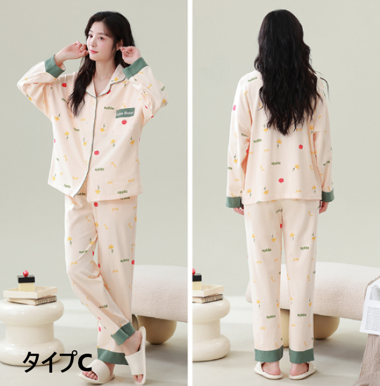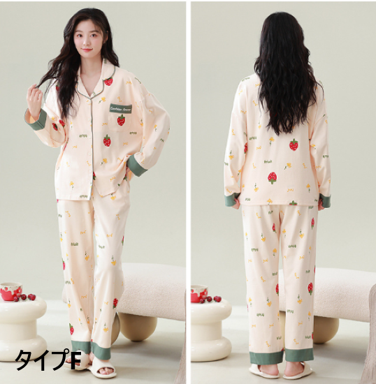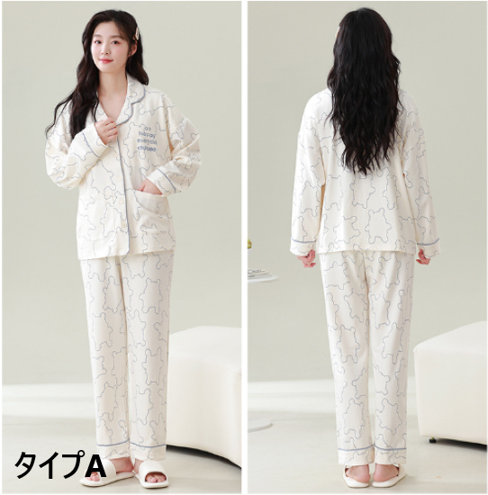 ルームウェア レディース パジャマ 上下セット ツーピース 長袖 ロングパンツ 襟あり プリント キュート 可愛い フロントボタン リラックス ホームウェア ナイトウェア おうち服 部屋着 室内着
