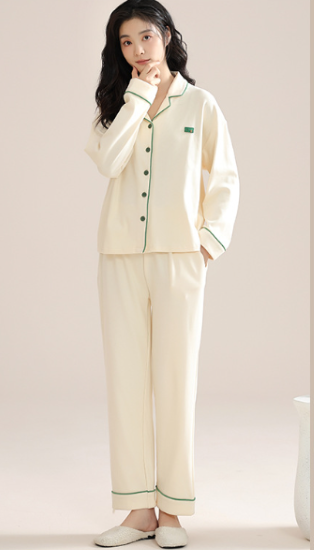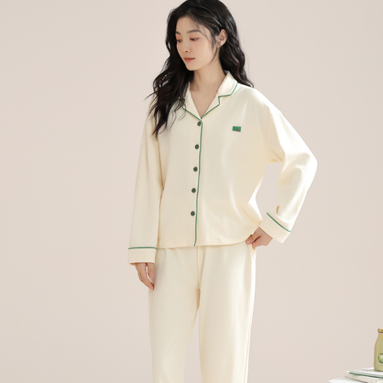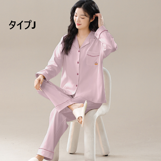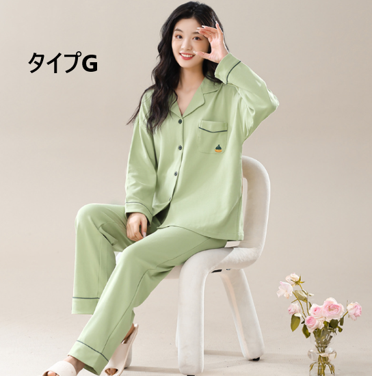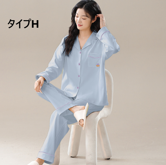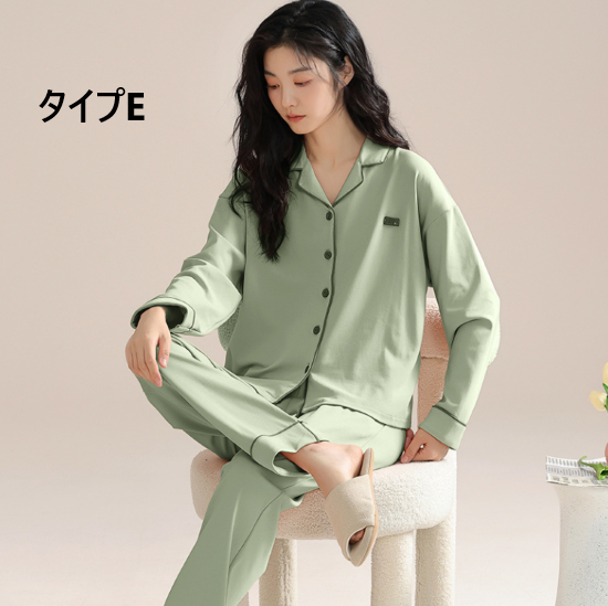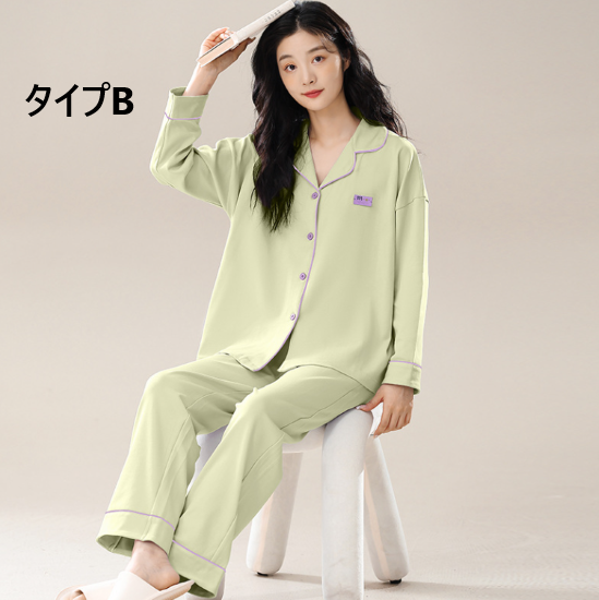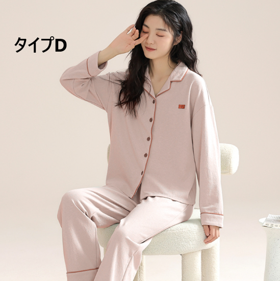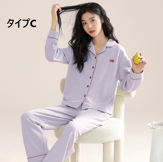 ルームウェア レディース パジャマ 上下セット ツーピース 長袖 ロングパンツ シンプル 無地 ベーシック パイピング 襟あり フロントボタン ナイトウェア ホームウェア コットン おうち服 部屋着