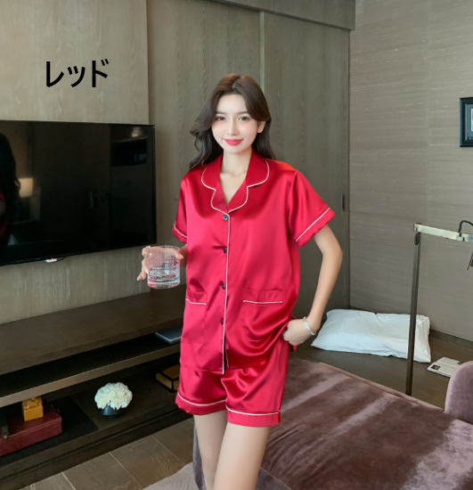 ルームウェア レディース パジャマ 上下セット ツーピース 半袖 ショートパンツ 光沢 フロントボタン 襟あり パイピング シンプル 無地 春夏 リラックス おうち服 ホームウェア ナイトウェア