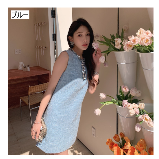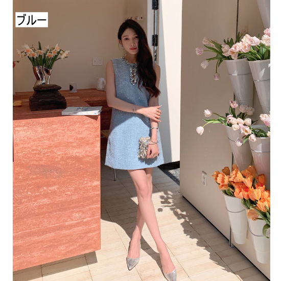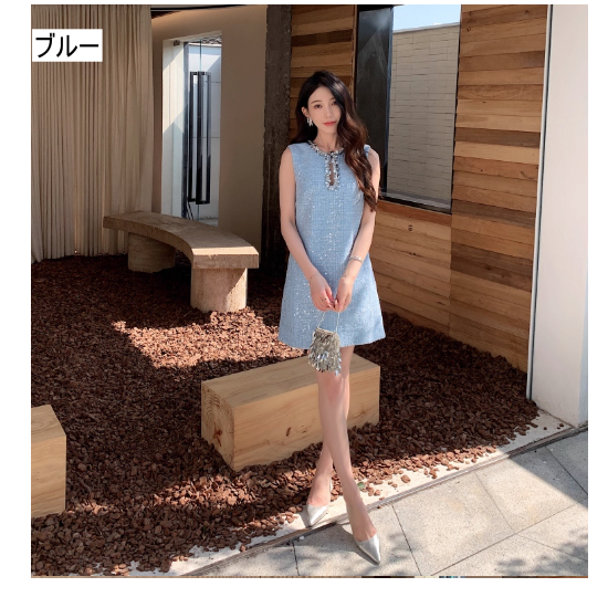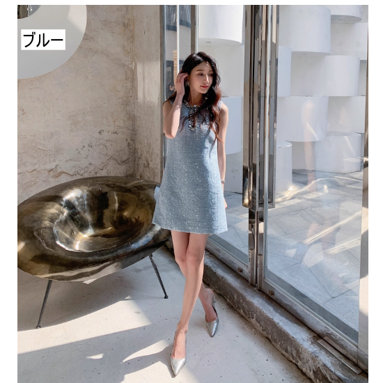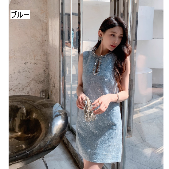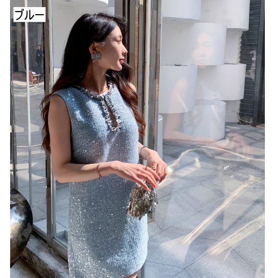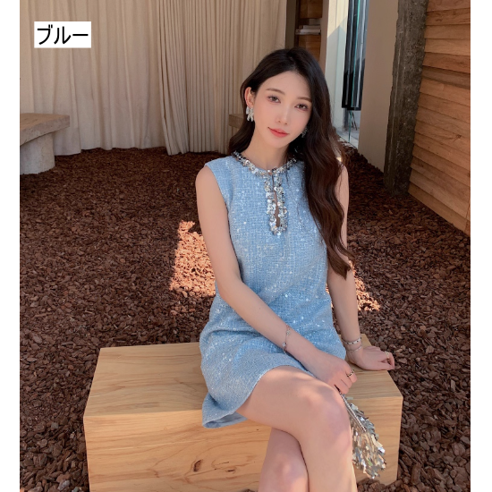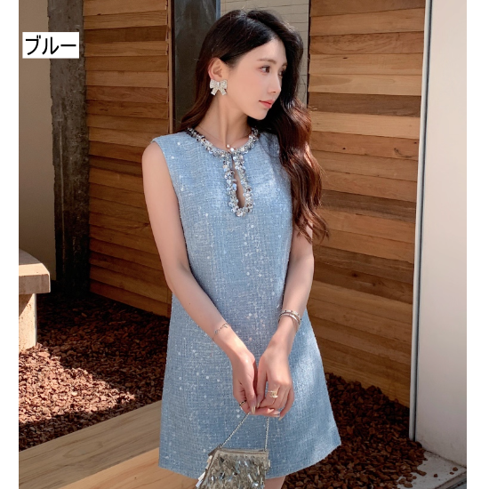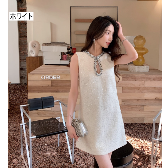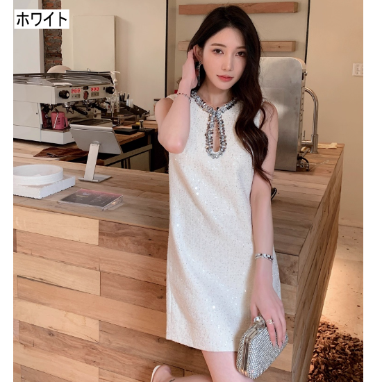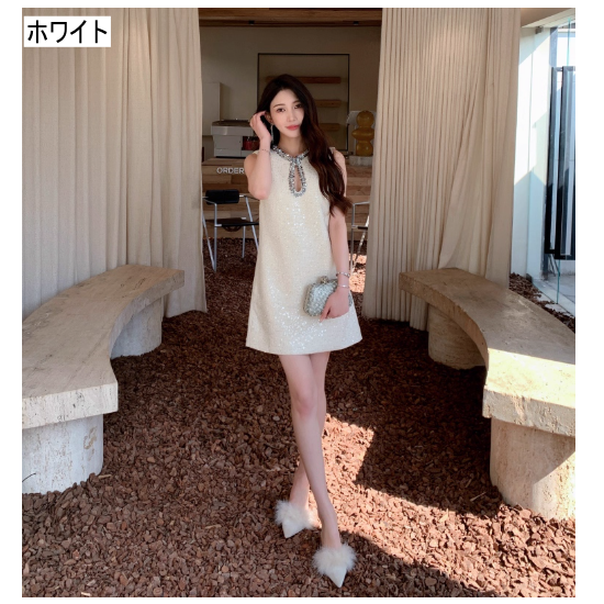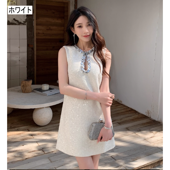 結婚式ドレス パーティー レディースファッション ワンピースドレス ノースリーブドレス ショートドレス スパンコール ベーシックカラー 体型カバー Aライン 光沢感 お洒落 綺麗め 韓国風 20代