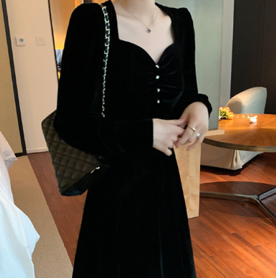 パーティードレス レディース 結婚式ドレス 演奏会ドレス ロングワンピース 長袖 ベルベット 上品 大人っぽい 黒 ブラック ハートネック 廃ウエスト きれいめ エレガント お呼ばれ フォーマル 女性