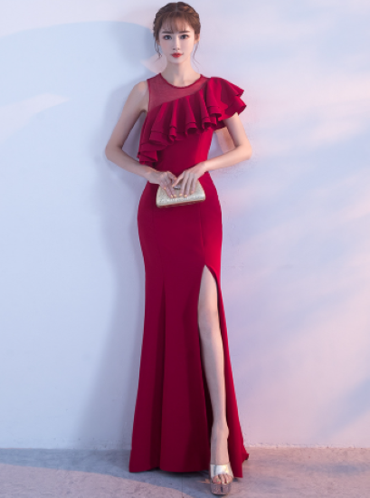 演奏会ドレス レディース 結婚式ドレス パーティードレス ロングドレス スリット フリル アシンメトリー ノースリーブ ラウンドネック きれいめ エレガント お呼ばれ フォーマル 女性 ファッション