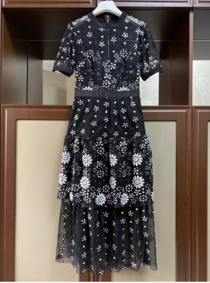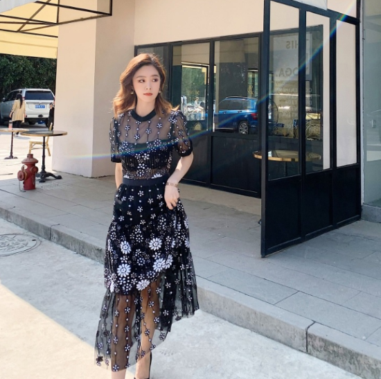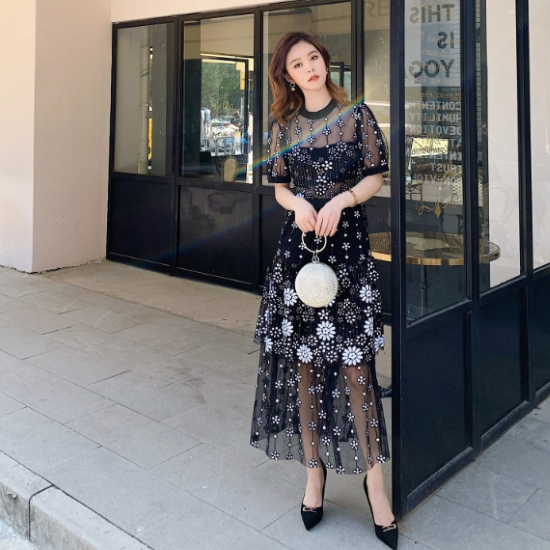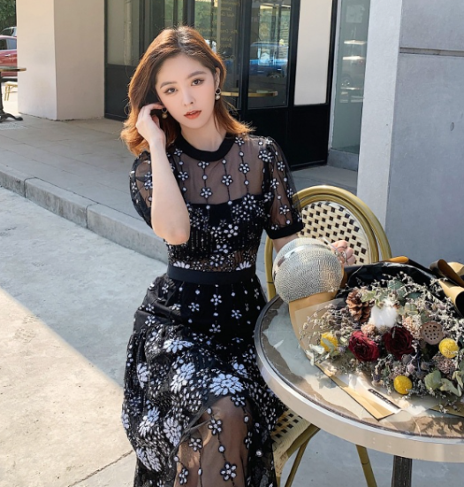 パーティードレス レディース 結婚式ドレス 演奏会ドレス ワンピースドレス 半袖 ラウンドネック パフスリーブ 花柄 フラワー フローラル レース シアー きれいめ エレガント ハイウエスト お呼ばれ