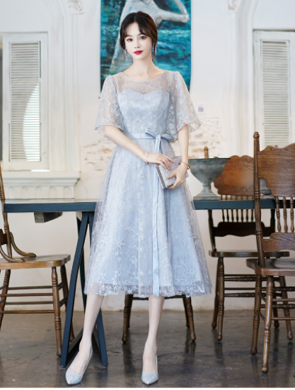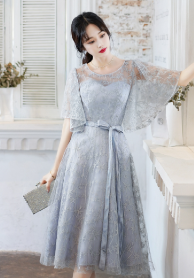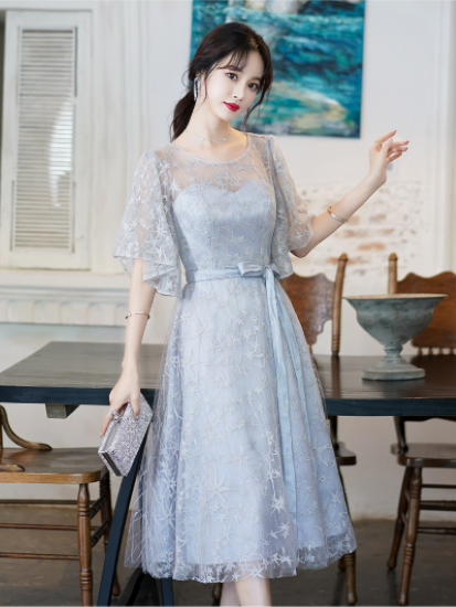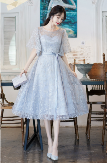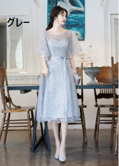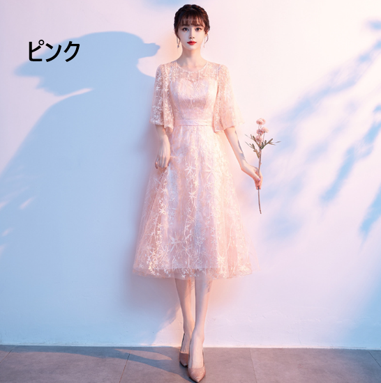 パーティードレス レディース 結婚式ドレス 演奏会ドレス ハイウエスト Aラインスカート フレア ラウンドネック 半袖 レース きれいめ エレガント フェミニン お呼ばれ フォーマル 上品 女性