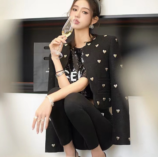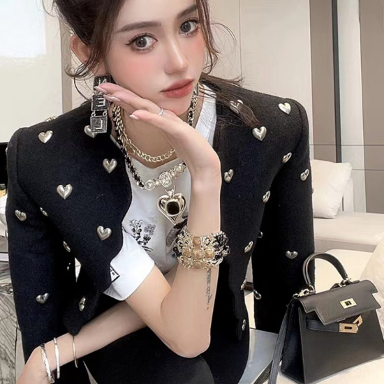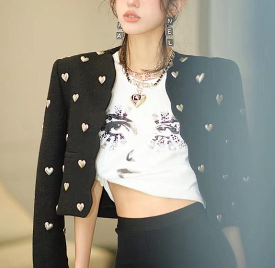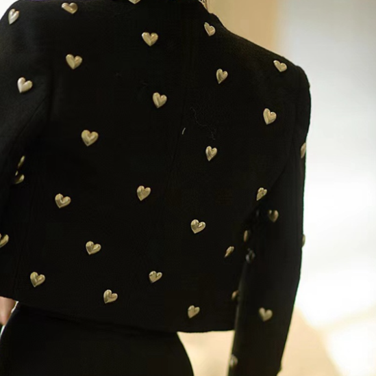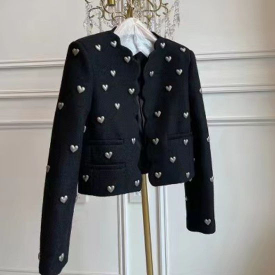 ジャケット レディース アウター 羽織 上着 長袖 ショート丈 ノーカラー ハート柄 キュート 可愛い 黒 ブラック カジュアル お出かけ おしゃれ きれいめ エレガント フォーマル ファッション