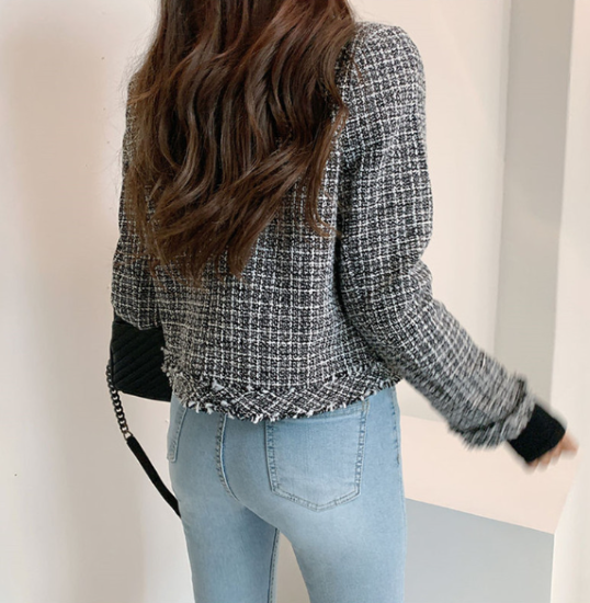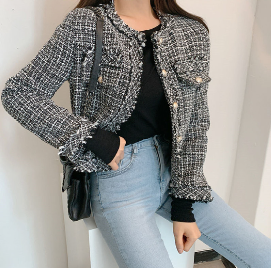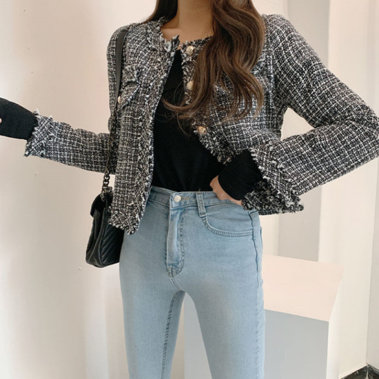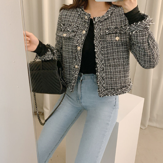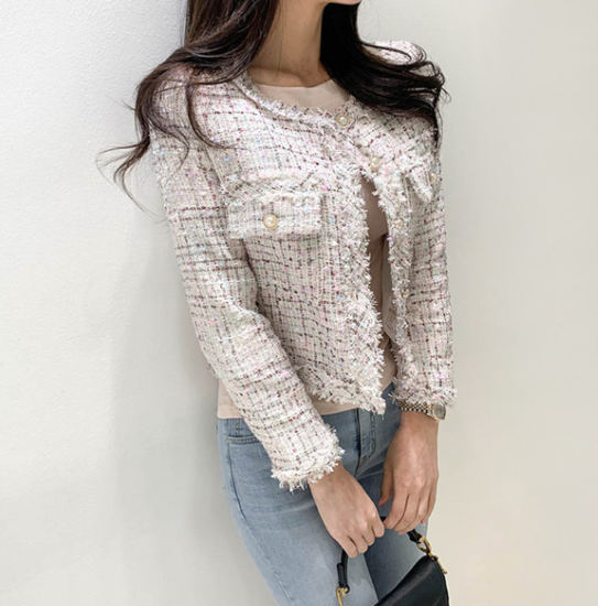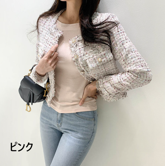 ジャケット レディース アウター 羽織 上着 ツイード フリンジ ショート丈 長袖 ノーカラー フロントボタン 上品 大人っぽい カジュアル お出かけ おしゃれ きれいめ エレガント ファッション